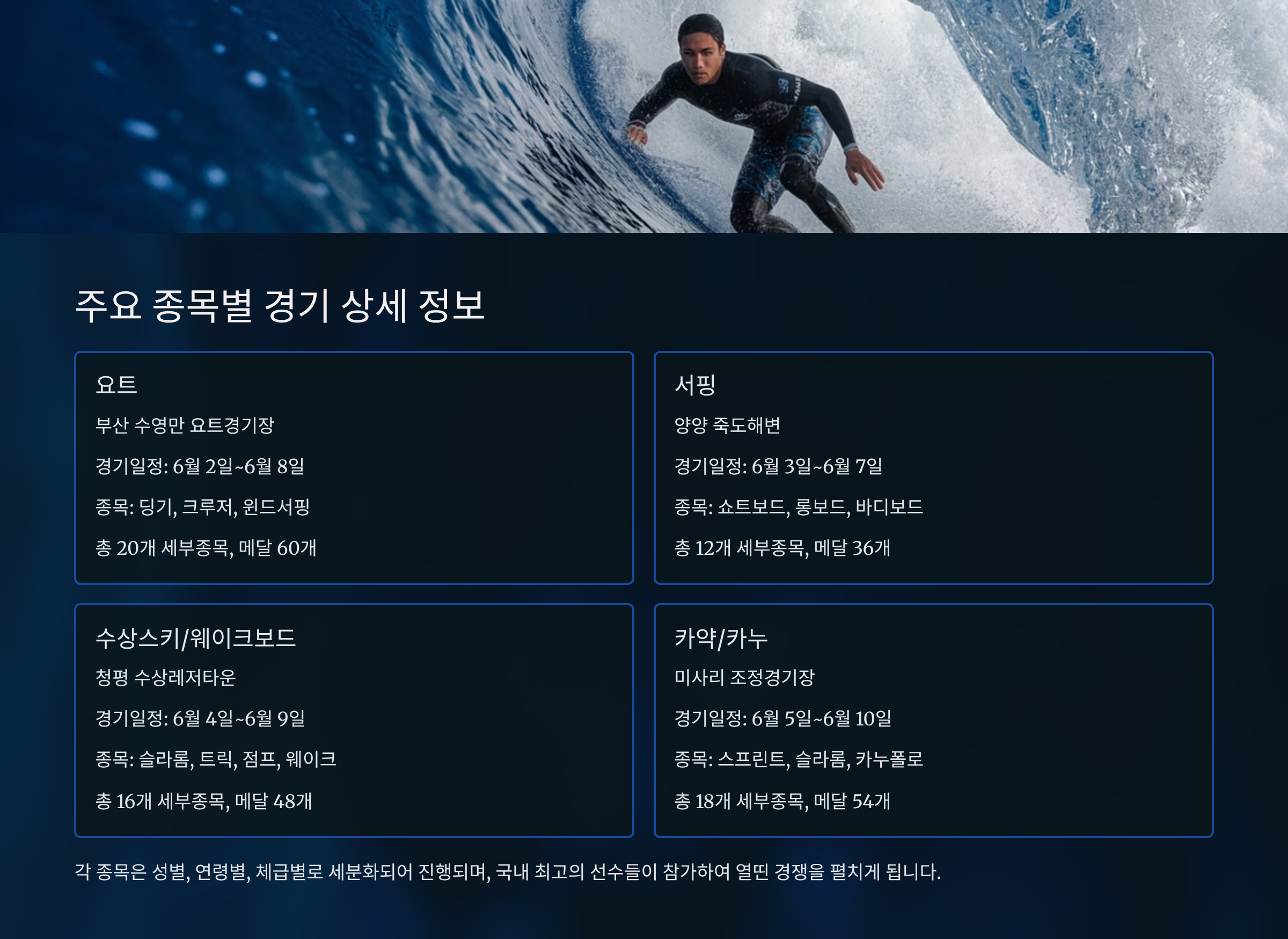 요트, 카누, 핀수영, 바다수영 등 다양한 종목이 있습니다.
