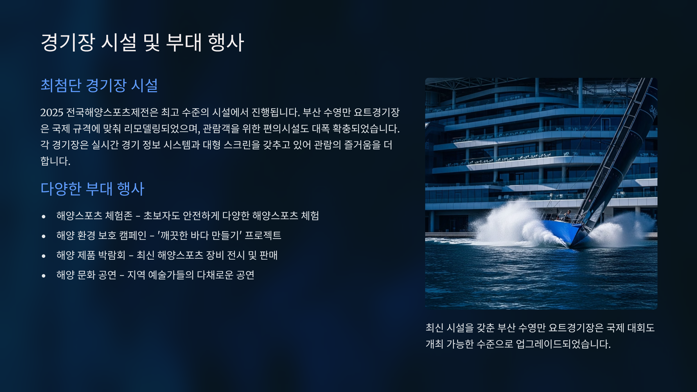 내가 생각했을 때, 해양스포츠제전은 그 어느 스포츠 축제보다 역동적이고 시원한 매력을 가지고 있습니다. 푸른 바다 위에서 펼쳐지는 선수들의 치열한 경기는 보는 이들에게 짜릿한 전율을 선사하며, 가족 단위 방문객에게는 새로운 추억을 만들 수 있는 소중한 시간이 될 것입니다. 해양수산부가 주최하고 대한체육회 등이 후원하는 이 행사는 그 공신력을 바탕으로 매년 높은 수준의 운영과 경기력을 선보이고 있습니다.