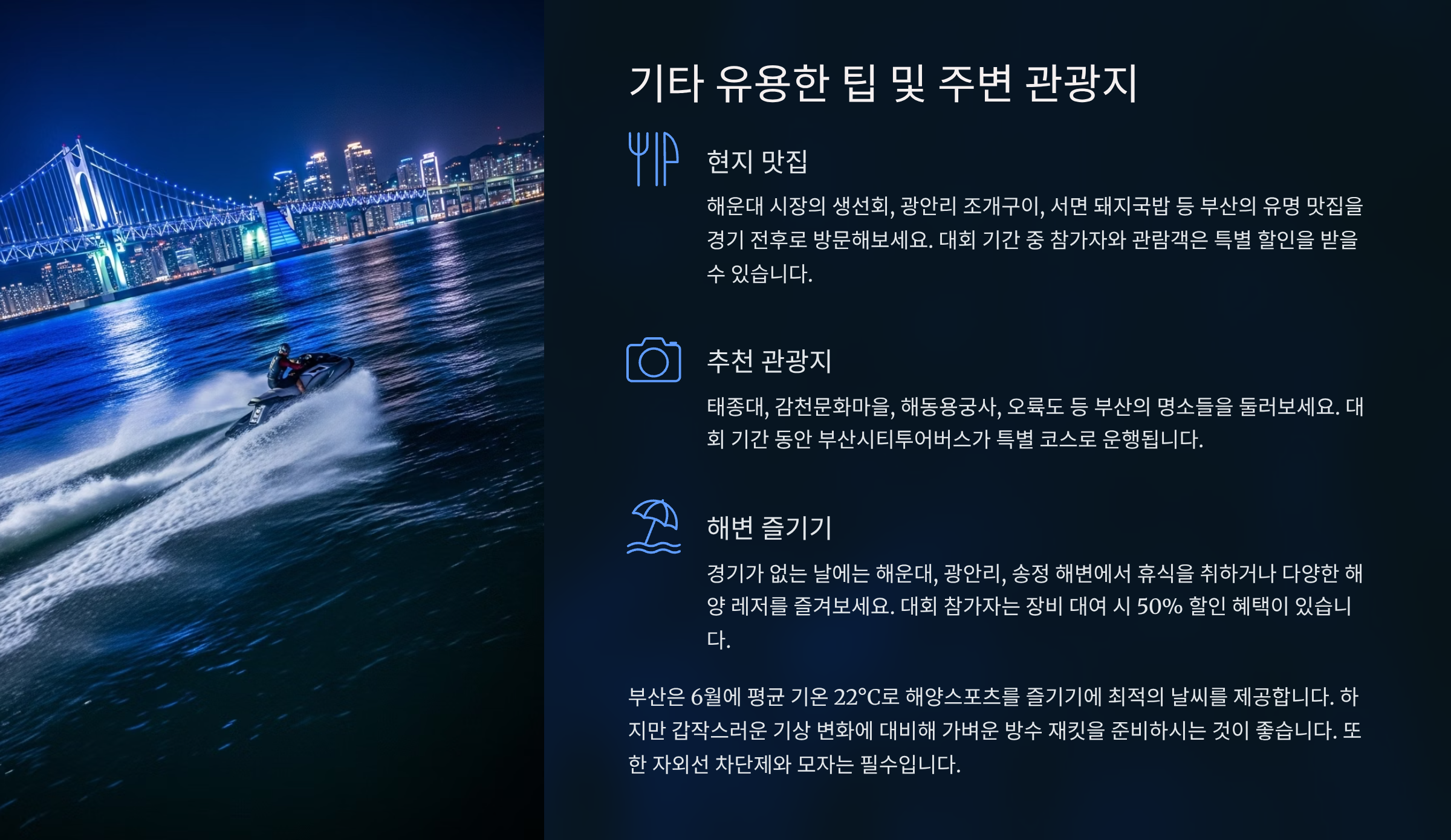 대회가 열리는 해변과 그 주변은 경기장 외에도 다양한 부대 시설과 행사로 꾸며질 예정입니다. 관람객 편의를 위해 먹거리 부스, 휴게 공간, 의료 지원 시설 등이 마련되며, 가족 단위 방문객을 위한 어린이 해양 체험 프로그램도 운영됩니다. 또한, 해양 스포츠 관련 장비 전시 및 판매 부스, 기념품 샵 등도 함께 운영되어 축제의 재미를 더할 것입니다. 저녁 시간에는 유명 가수들의 축하 공연이나 불꽃놀이 등 다채로운 문화 행사가 예정되어 있어, 낮에는 경기를 즐기고 밤에는 축제 분위기를 만끽할 수 있습니다. 행사장은 셔틀버스가 운행될 가능성이 높으니 대중교통 이용을 적극 추천합니다.