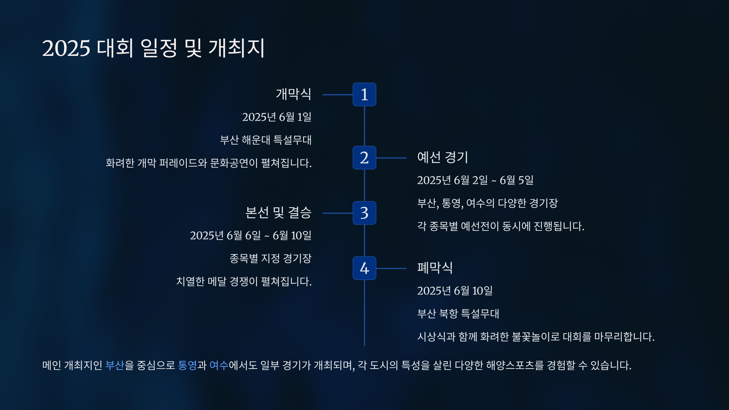 2025년 전국해양스포츠제전은 [도시명]에서 [날짜]에 개최될 예정입니다. 이는 해양스포츠의 중심지로서의 입지를 더욱 확고히 할 것으로 기대됩니다. 개최지는 넓은 해변과 해양 인프라를 갖추고 있어 다양한 종목을 안정적으로 진행할 수 있는 최적의 조건을 갖추고 있습니다. 대회 일정은 개막식부터 폐막식까지 약 [일수]일간 진행될 예정이며, 매일 다른 종목의 예선과 본선 경기가 펼쳐져 방문객들이 지루할 틈 없이 축제를 즐길 수 있습니다. 상세 일정은 아직 확정되지 않았으나, 예년의 경우 8월 중순에서 말 사이에 진행되었으므로 올해도 비슷한 시기에 개최될 것으로 예상됩니다. 이 기간 동안에는 인근 숙박 시설과 교통편이 혼잡할 수 있으니 미리 준비하는 것이 좋습니다.