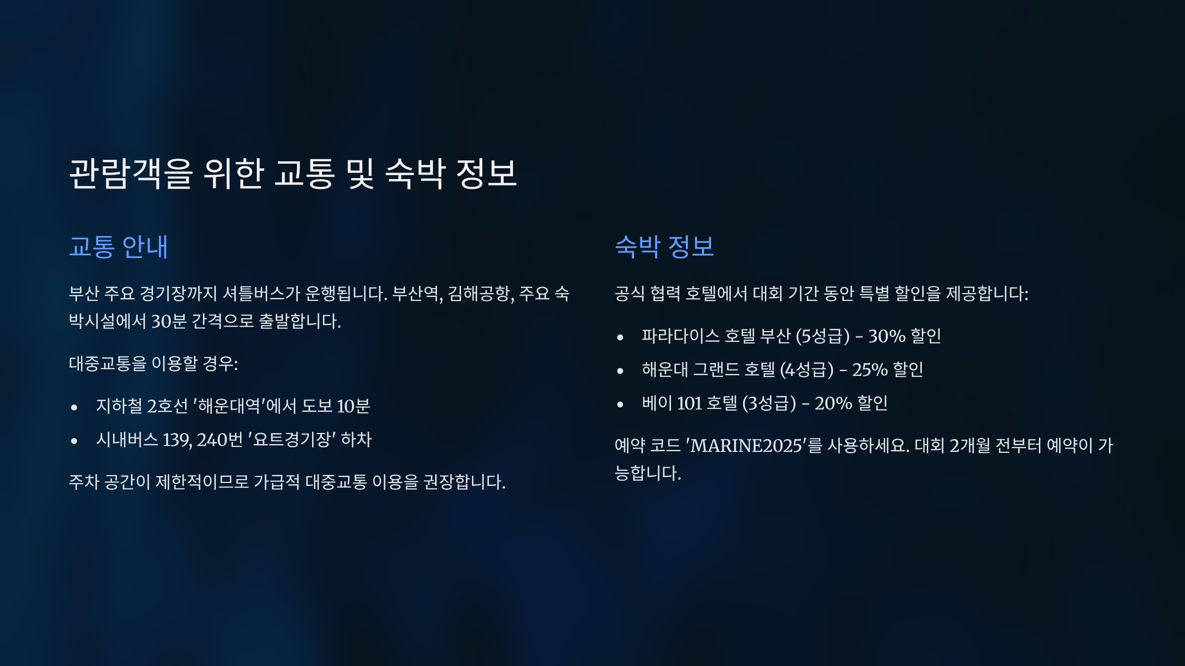 대회 관람객을 위한 교통 및 숙박 정보