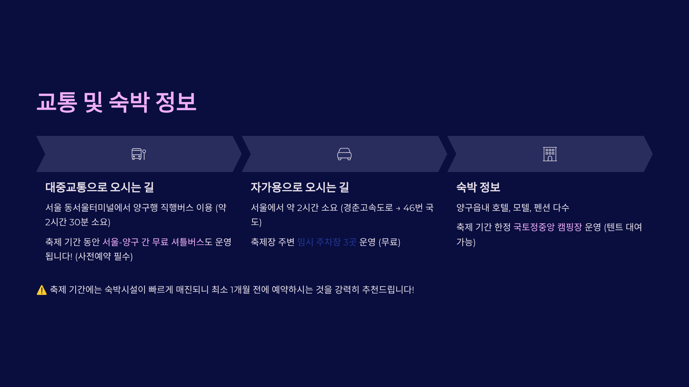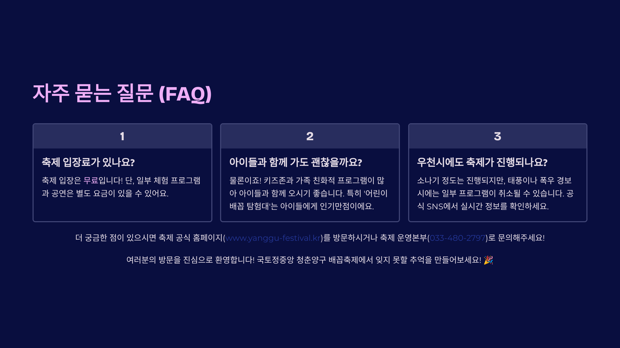 이 글에 포함된 2025년 축제 정보 및 일정은 양구군청 및 축제위원회 공식 발표를 참고하여 작성되었으며, 일부 프로그램 및 일정은 현지 사정에 따라 변경될 수 있습니다. 자세하고 정확한 정보는 방문 전에 양구군청 공식 홈페이지나 축제 관련 SNS 채널을 통해 확인하시기를 권장합니다. 모든 수치와 일정은 추정치이며, 확정된 사항은 반드시 공식 채널을 통해 확인이 필요합니다.