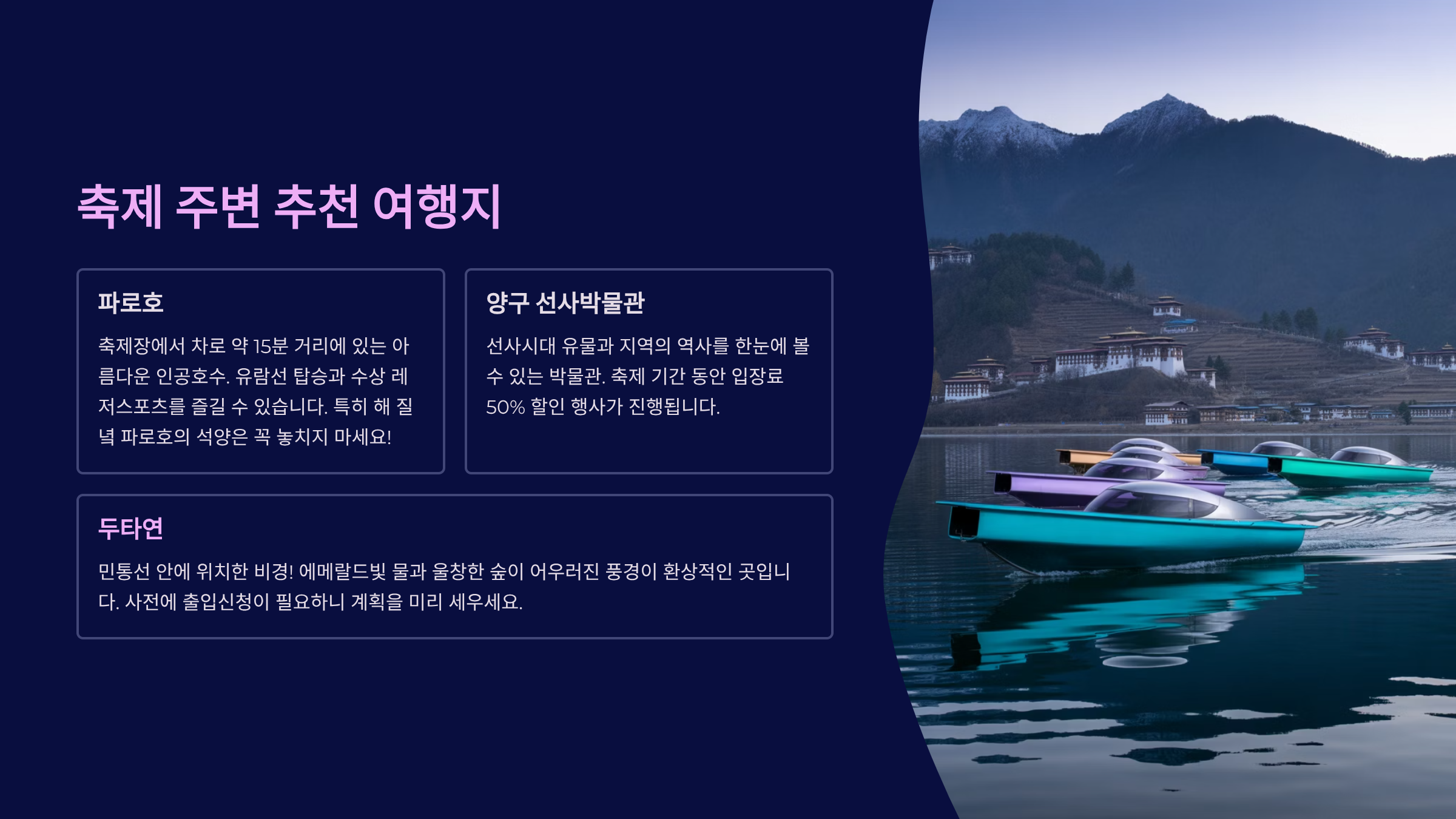 본 글은 정보 제공 목적으로 작성되었으며, 축제 일정, 프로그램 등은 현지 사정에 따라 변경될 수 있습니다. 모든 수치 및 정보는 추정치이므로, 방문 전 반드시 관련 공식 채널을 통해 최신 정보를 확인하시기 바랍니다. 본 글의 내용에 대한 최종적인 책임은 이용자 본인에게 있습니다.