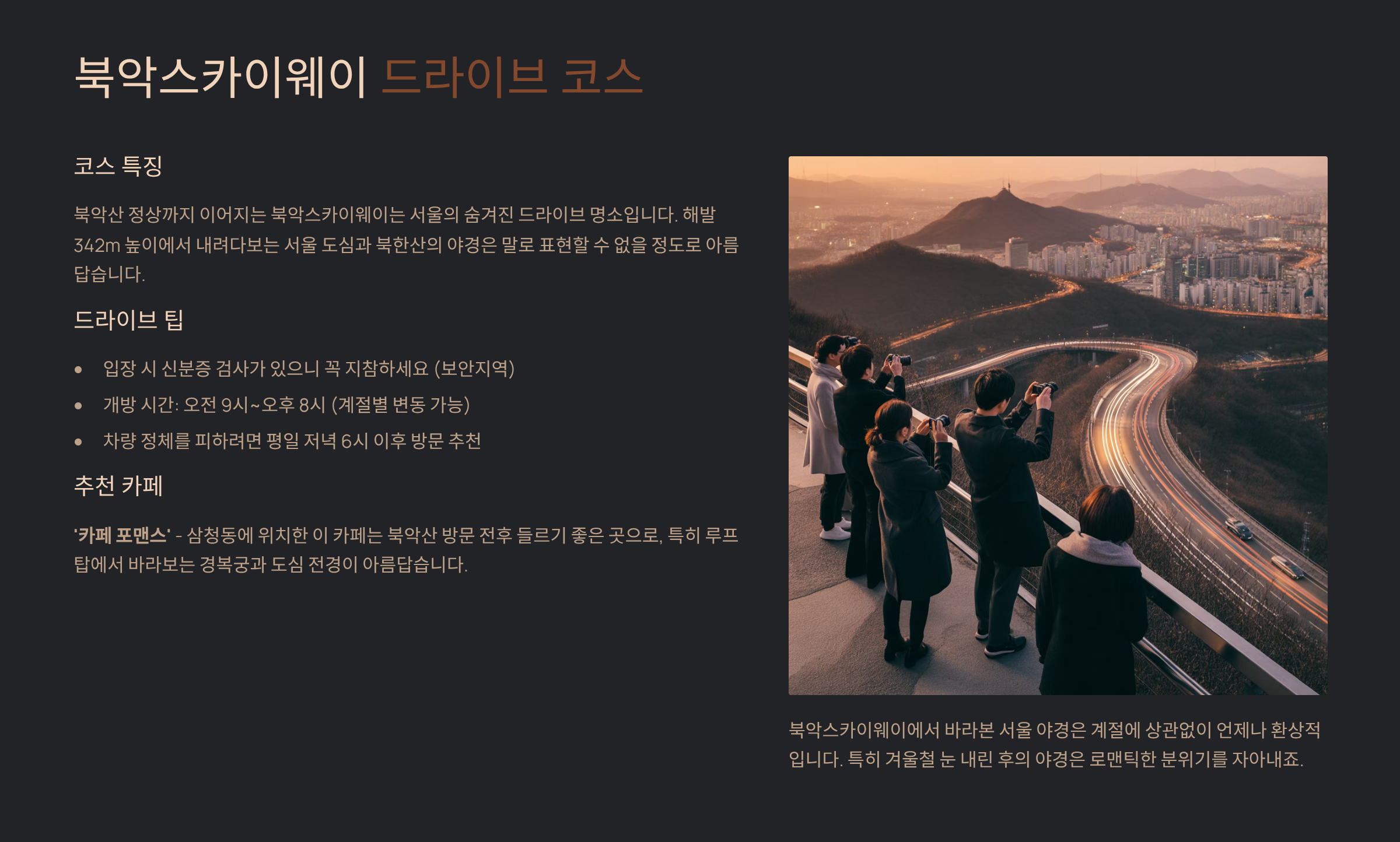 | 북악스카이웨이 | 서울 도심과 북한산 야경 동시 감상 |