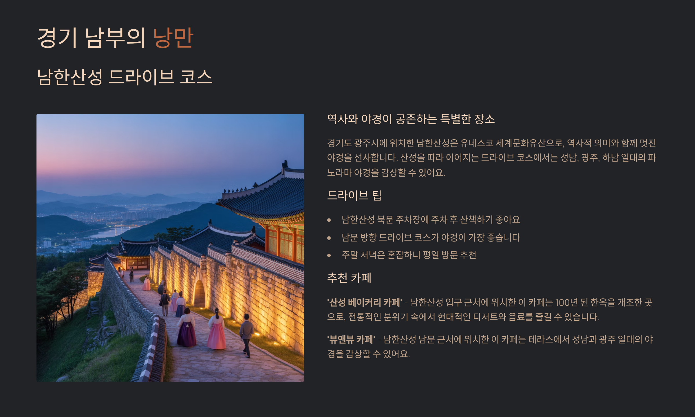 맛집 검색하기5. 경기 남부의 낭만: 남한산성 드라이브 코스