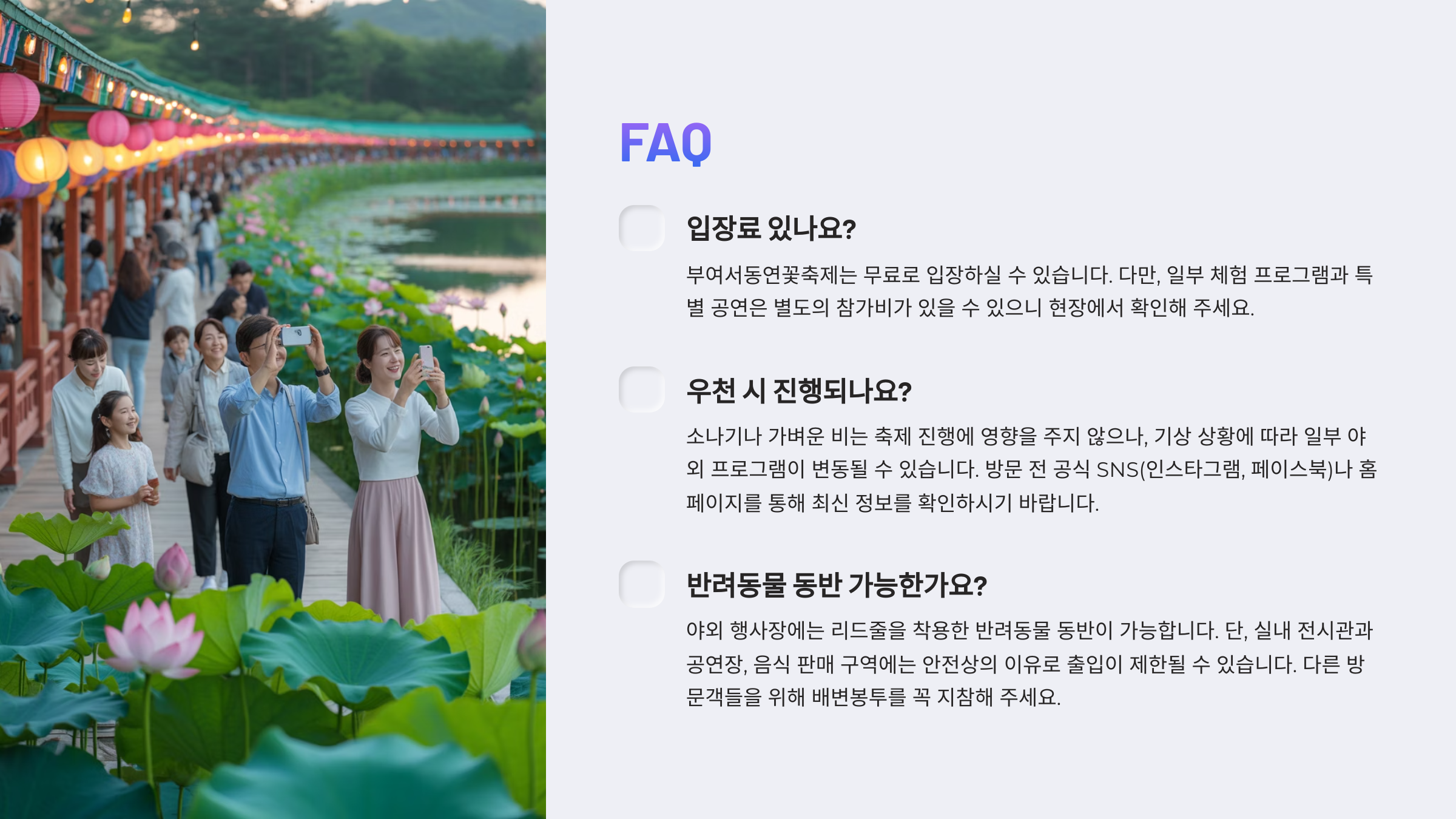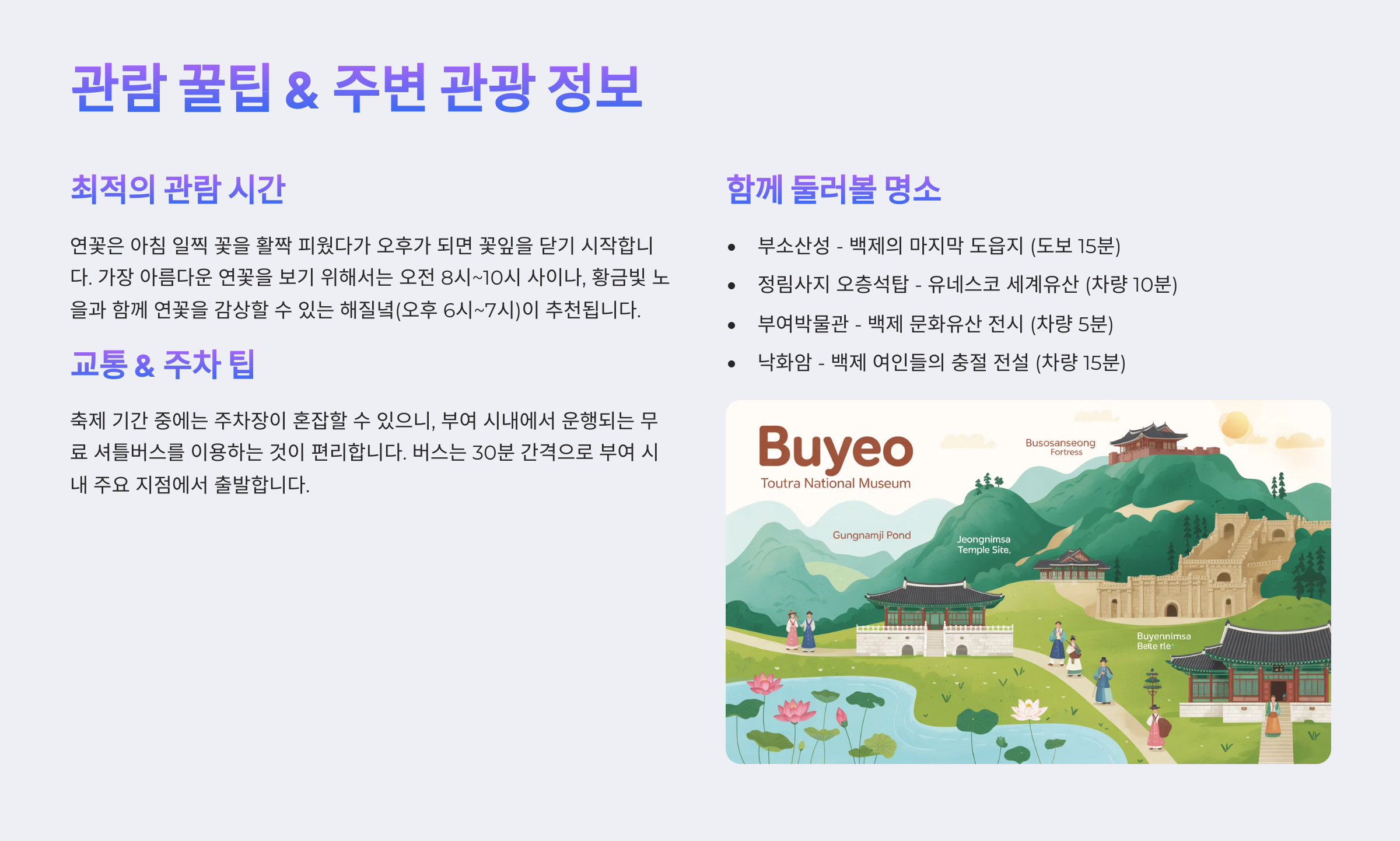 축제장 인근에는 백제문화단지, 부소산성, 정림사지, 국립부여박물관, 능산리고분군, 백마강 유람선 등 부여의 대표 유적과 체험명소가 모여 있어요. 연꽃축제와 함께 백제역사탐방을 묶어서 여행 코스로 즐기면 진짜 풍성한 여름 여행이 돼요!