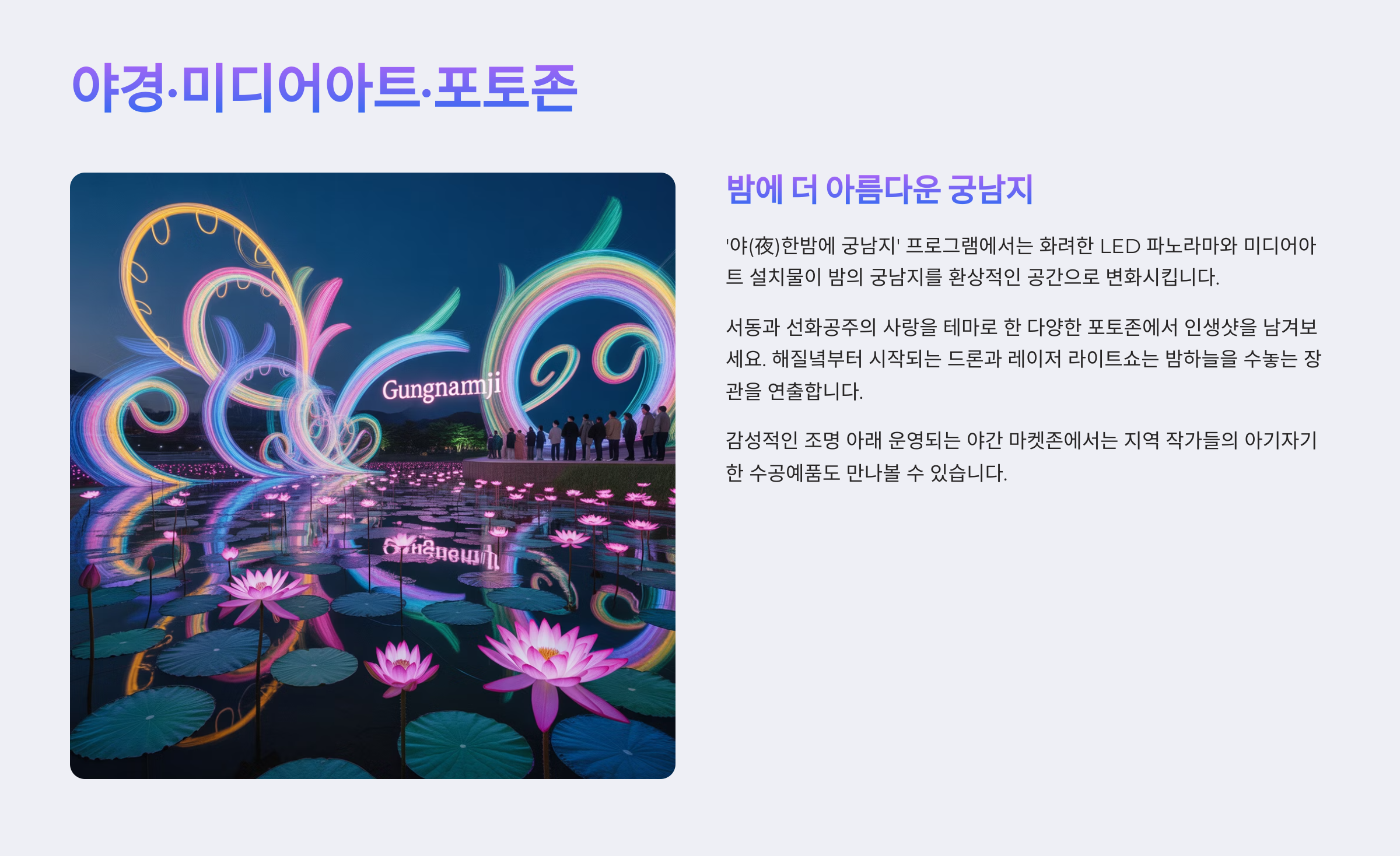 미디어아트는 매년 새로운 테마로 기획되어, 백제 왕실과 연꽃의 환상적인 이야기를 실감나는 빛과 음향, 스토리텔링으로 선보여요. 연꽃섬 전체가 한순간에 거대한 아트월로 바뀌기도 하고, 다리 아래 레이저 쇼와 음악분수 퍼포먼스가 밤의 궁남지를 열기로 가득 채운답니다.