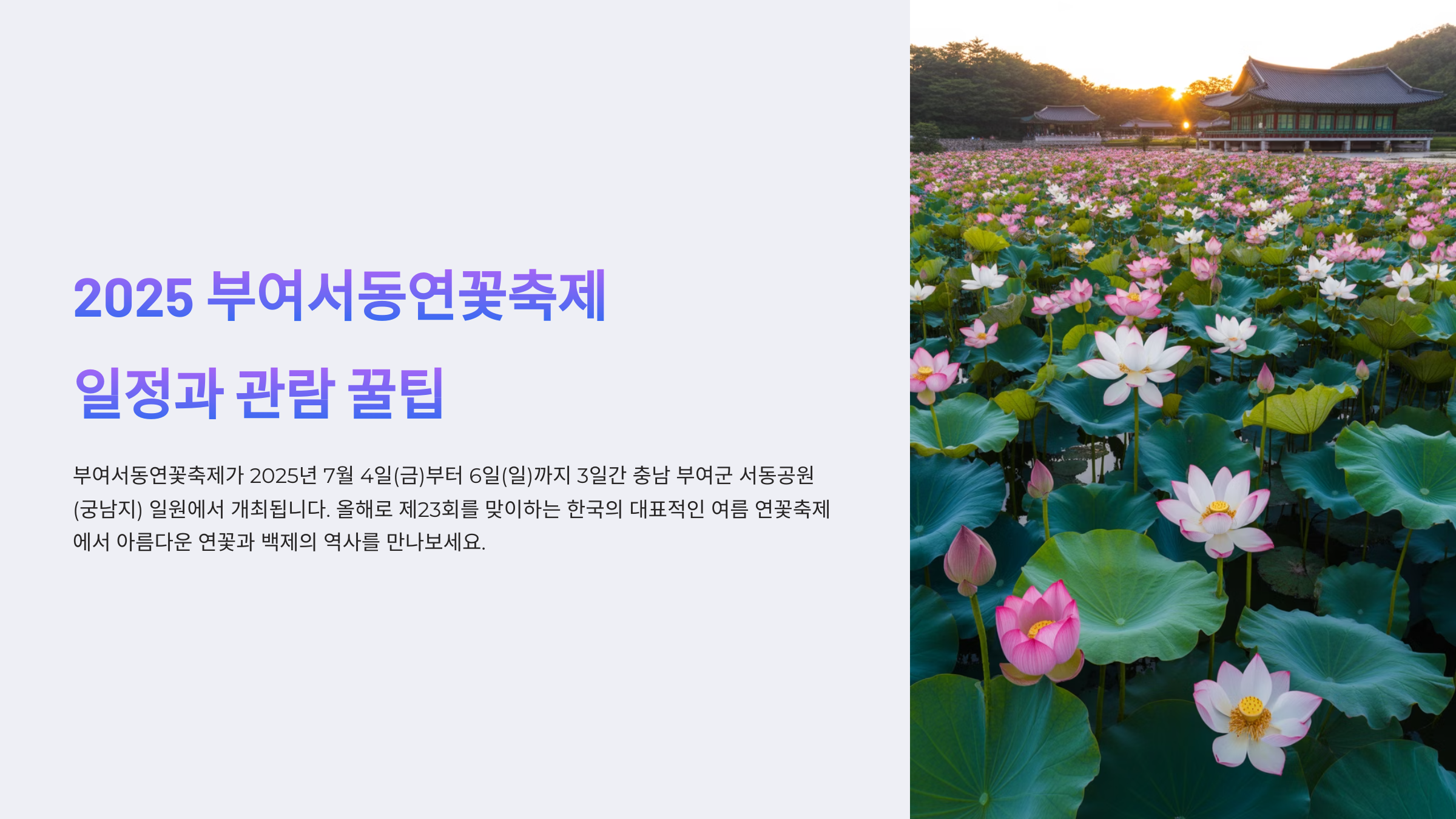 이제부터 2025년 부여서동연꽃축제의 유래, 하이라이트, 연꽃정원, 야경, 전통체험, 관람팁, FAQ까지 풀버전으로 쭉 이어서 안내해드릴게요! (문단, 표, 후킹멘트, 버튼, 꿀팁 모두 빠짐없이!🌸)