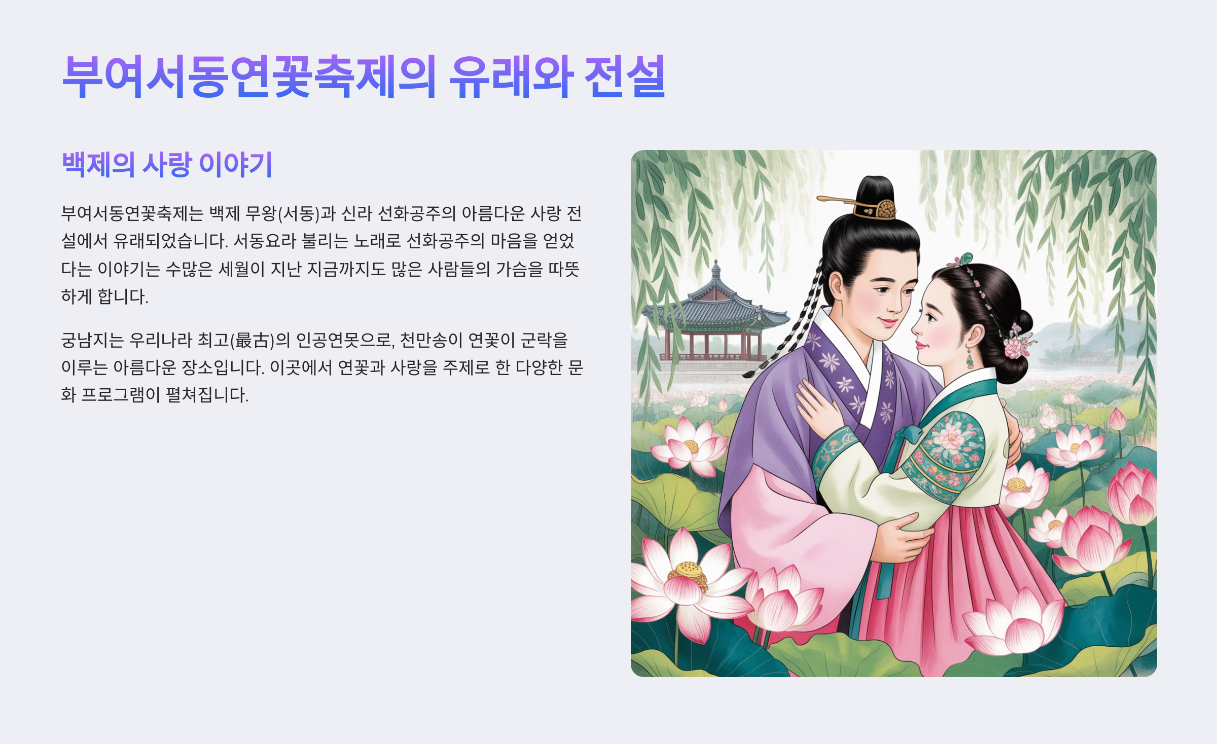 이 전설은 시간이 흘러도 지역 사람들과 축제 방문객 모두에게 감동을 전해주죠. 매년 축제 기간이면 궁남지 무대에서는 이 스토리를 테마로 한 뮤지컬, 거리 퍼레이드, 퍼포먼스가 계속 이어지고, 실제 연못 위에서 선화공주와 무왕을 재현하는 스토리텔링 이벤트가 정말 인기랍니다!
