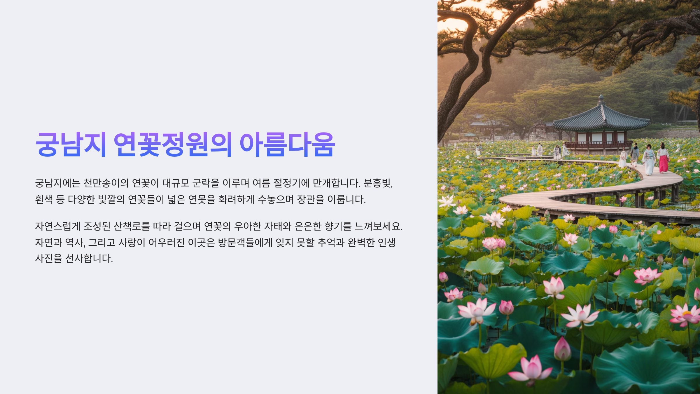 서동요를 테마로 한 어린이 창작뮤지컬, 궁남지 연못을 배경 삼은 연꽃불빛 쇼, 야간 미디어아트&레이저 쇼는 인생 야경 명소로도 손꼽혀요. 특히 해질 무렵 연꽃길을 따라 걷다보면 저절로 “이 순간이 영화 같다”는 말이 절로 나와요.