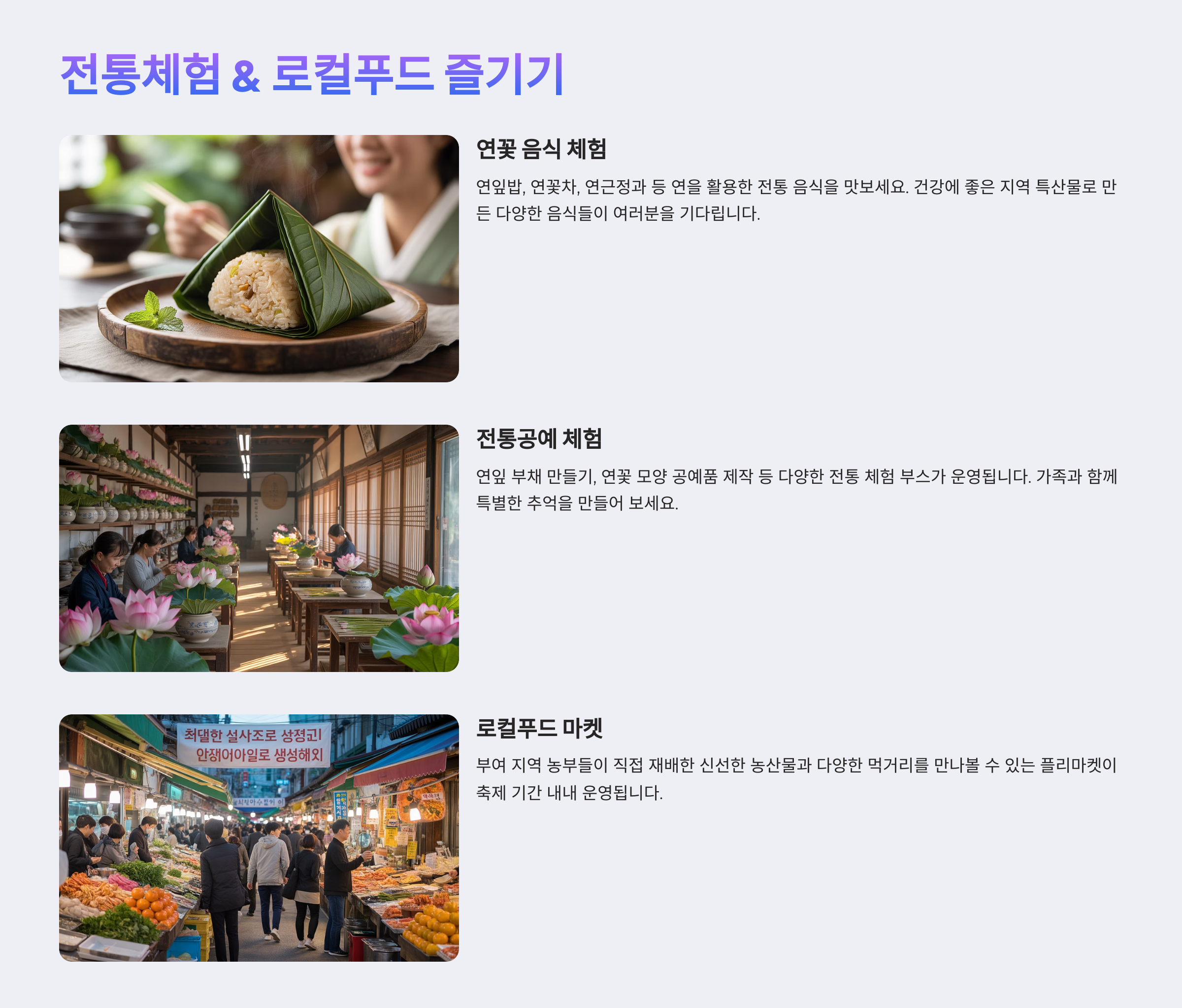 직접 만든 연꽃기념품, 이색 먹거리, 현장 이벤트까지 부여여행의 특별한 즐거움이 모두 모였어요!