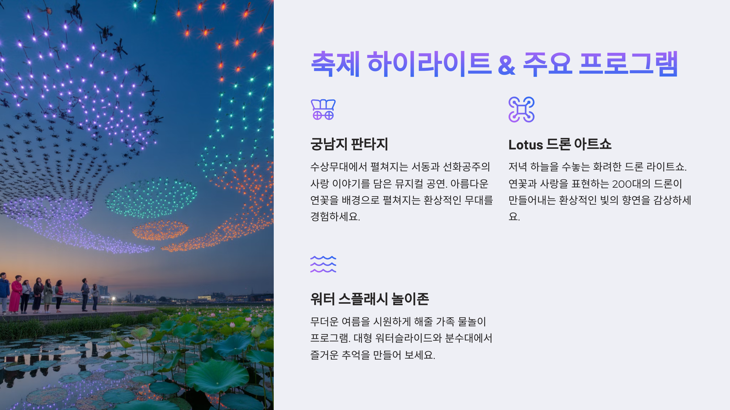 여기선 단순히 꽃만 보는 게 아니에요. 연꽃차·연근 아이스크림·연꽃도장·연꽃캘리그라피 등 직접 체험하는 재미, 미디어아트 야경과 서동요 스토리텔링, 전국구 명소 포토존, 힐링 피크닉존까지 진짜 오감이 다 행복한 곳! 매년 새로운 프로그램, 인생샷 명소, 전설이 살아 숨 쉬는 궁남지의 여름을 만나러 오세요.