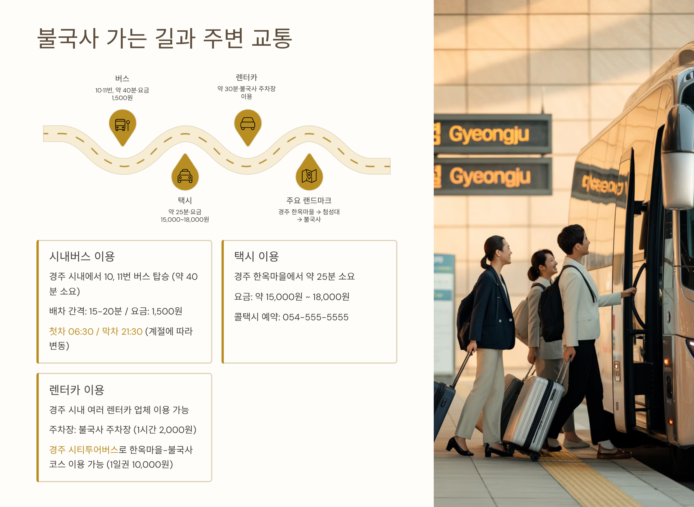 | 자가용 | 불국사 공영주차장 이용 (성수기 혼잡) |