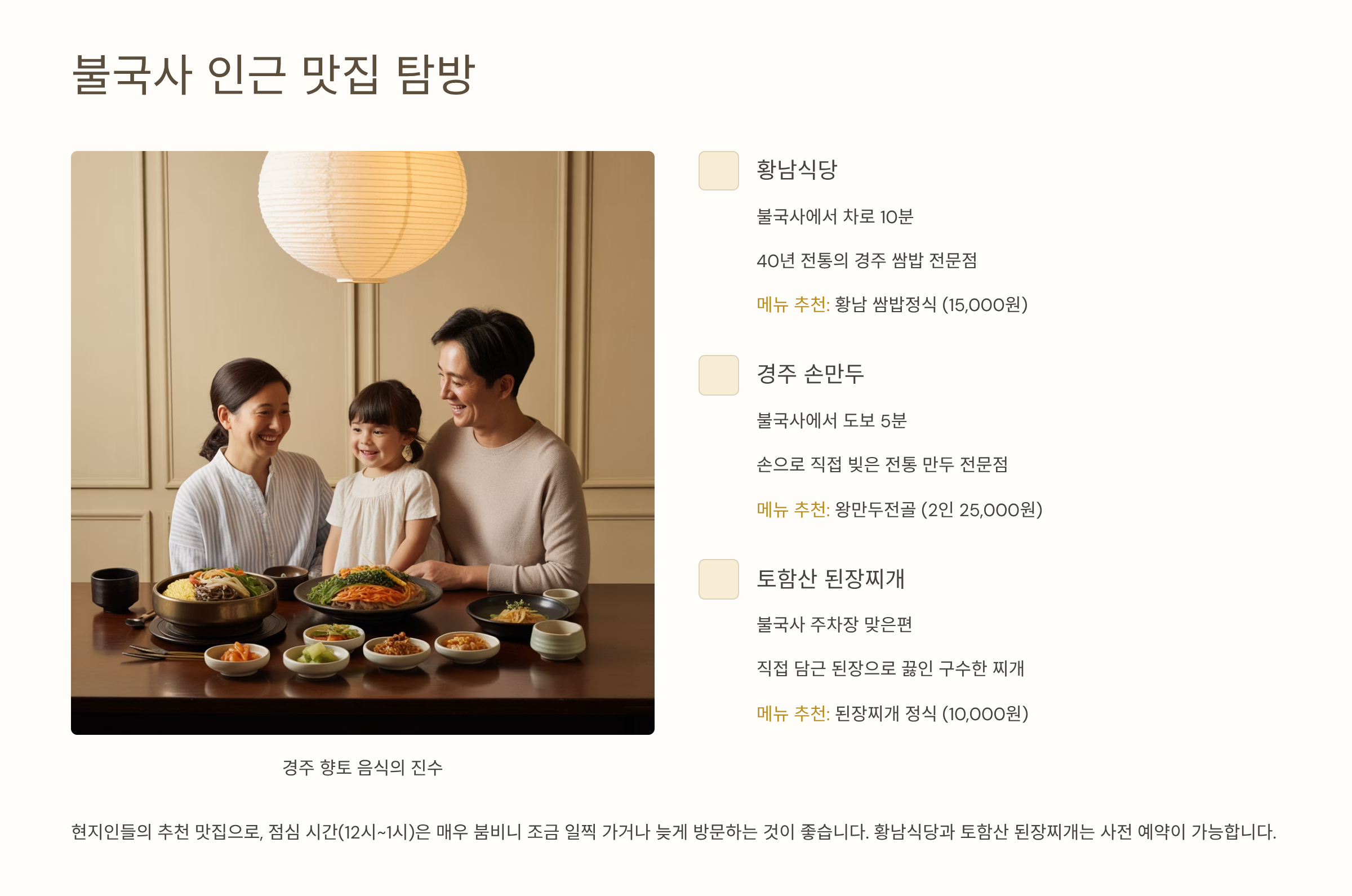 불국사 주변에는 경주 여행의 피로를 풀어줄 다양한 맛집들이 즐비해 있습니다. 가장 유명한 메뉴는 역시 '쌈밥'입니다. 신선한 채소와 함께 떡갈비, 제육볶음 등 다양한 반찬이 푸짐하게 나오는 쌈밥 정식은 여행객들의 든든한 한 끼를 책임집니다. 불국사 정문 주변에는 많은 쌈밥집이 모여 있어 취향에 맞는 식당을 선택할 수 있습니다. 또한, 경주 전통 비빔밥도 빼놓을 수 없는 메뉴입니다. 다양한 나물과 고명이 어우러진 비빔밥은 신라의 고유한 맛을 느끼게 해줍니다. 식사 후에는 불국사 상가 주변에서 판매하는 '황남빵'이나 '찰보리빵'과 같은 경주의 대표적인 간식들을 맛보는 것도 좋습니다. 이 외에도 다양한 카페와 한정식 식당들이 있어, 여행객들은 자신의 입맛에 맞는 음식을 선택할 수 있습니다. 경주에는 전통적인 맛집 외에도 젊은 감각의 퓨전 식당들이 많이 생겨나고 있어 선택의 폭이 넓어졌습니다. 경주 맛집 정보는 메뉴판 닷컴 등 맛집 정보 사이트에서 참고할 수 있습니다.