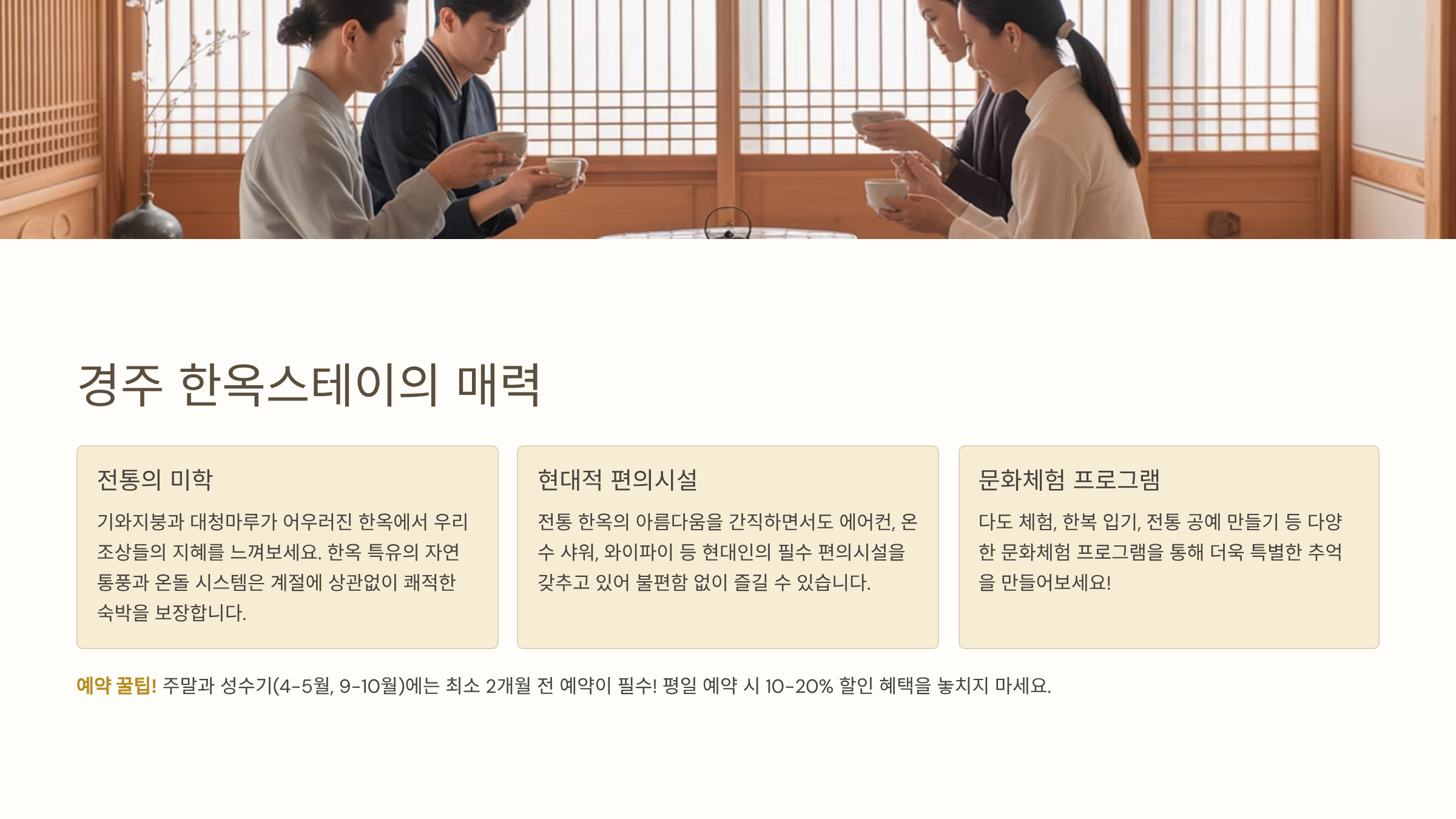 천년의 역사를 품고 있는 고도(古都) 경주는 그 자체로 거대한 박물관입니다. 도시 곳곳에 신라의 역사가 살아 숨 쉬고 있으며, 특히 전통 한옥의 아름다움을 간직한 숙소들은 여행객들에게 특별한 경험을 선사합니다. 한옥스테이에서 고즈넉한 시간을 보내고, 신라 시대 건축 기술의 정수인 불국사를 거닐며 역사를 느끼는 코스는 경주 여행의 백미라 할 수 있습니다. 이 코스는 단순히 관광지를 둘러보는 것을 넘어, 과거와 현재가 공존하는 경주만의 독특한 분위기를 온전히 만끽할 수 있게 해줍니다. 한옥의 정취와 불국사의 웅장함이 어우러진 여행은 잊지 못할 추억을 만들어 줄 것입니다.