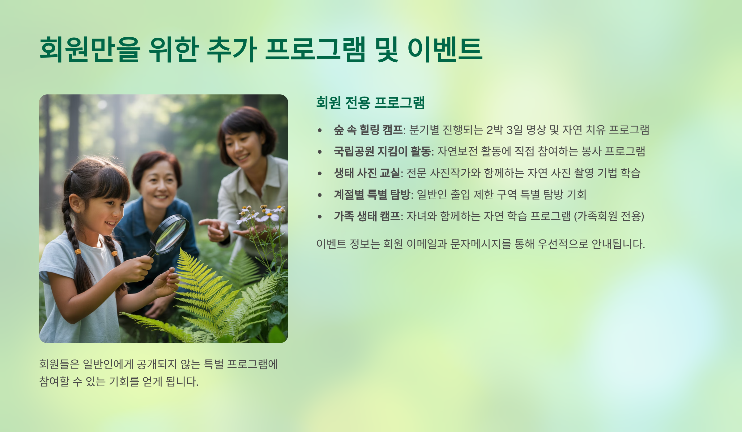 이러한 혜택 외에도 국립공원 회원 전용 이벤트나 비공개 탐방 프로그램에 참여할 수 있는 기회도 있습니다. 예를 들어, 평소 개방되지 않는 특별 구역을 탐방하거나, 전문가와 함께하는 심화 생태 탐사에 참여하는 등의 특별한 경험을 할 수 있습니다. 이러한 혜택들은 국립공원 멤버십의 가치를 더욱 높여주며, 자연을 사랑하는 사람들에게 특별한 자부심을 안겨줍니다. 다만, 모든 혜택은 회원 등급에 따라 차이가 있으며, 일부 혜택은 특정 시즌에만 제공될 수 있습니다.