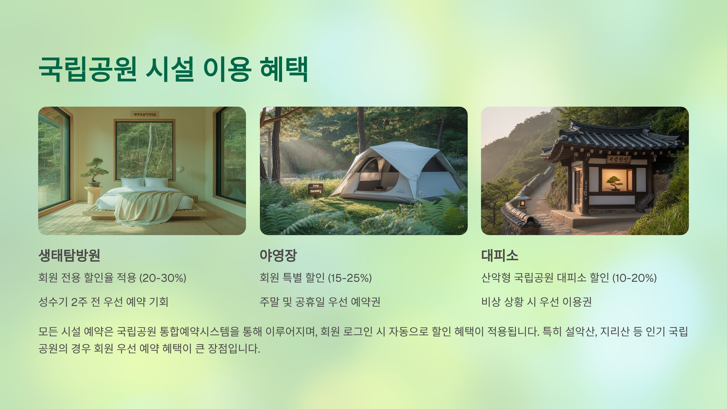 국립공원 멤버십의 실질적인 혜택은 공원 내 다양한 시설 이용료 할인에서 체감할 수 있습니다. 야영장, 자연휴양림, 대피소 등 숙박 및 편의 시설 이용 시 할인 혜택이 적용되어 가족 단위나 단체 탐방객에게 큰 도움이 됩니다. 예를 들어, 성수기 야영장 예약 시에도 할인율이 적용되므로 경제적인 부담을 줄일 수 있습니다. 또한, 일부 국립공원 내에 위치한 식당이나 매점에서도 멤버십 카드를 제시하면 할인을 받을 수 있는 경우가 있습니다. 이러한 혜택은 국립공원 탐방을 더욱 즐겁고 편리하게 만들어줍니다. 특히, 예약 경쟁이 치열한 성수기에는 멤버십 회원에게만 우선적으로 예약 기회를 제공하는 경우도 있으므로, 사전에 공지사항을 확인하는 것이 좋습니다.