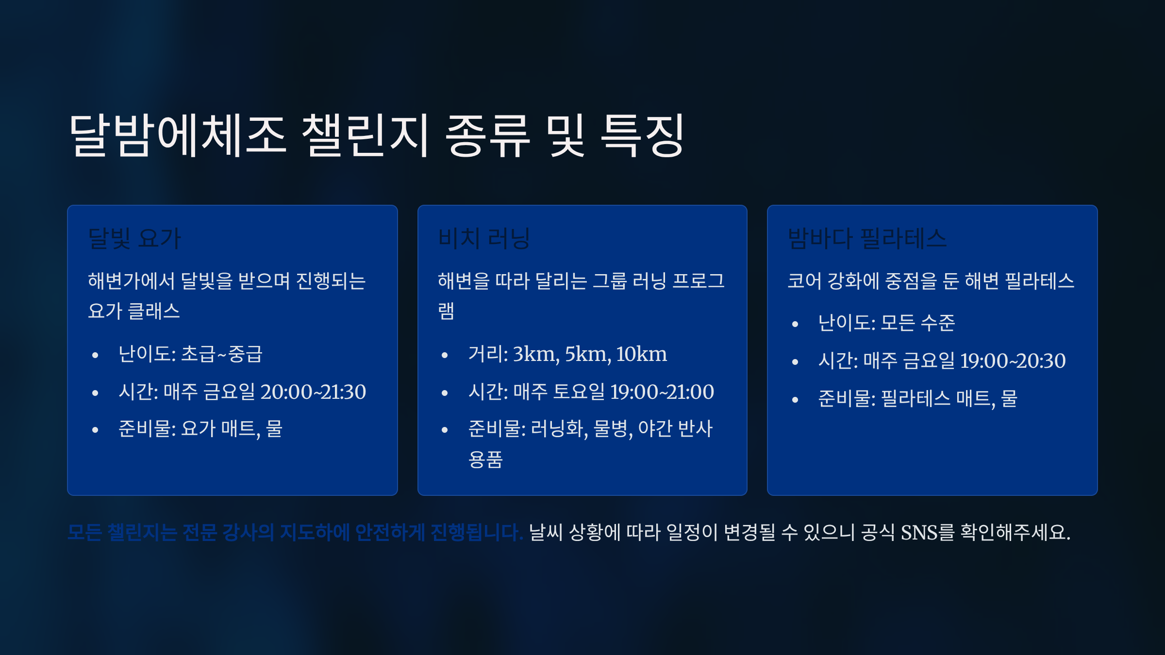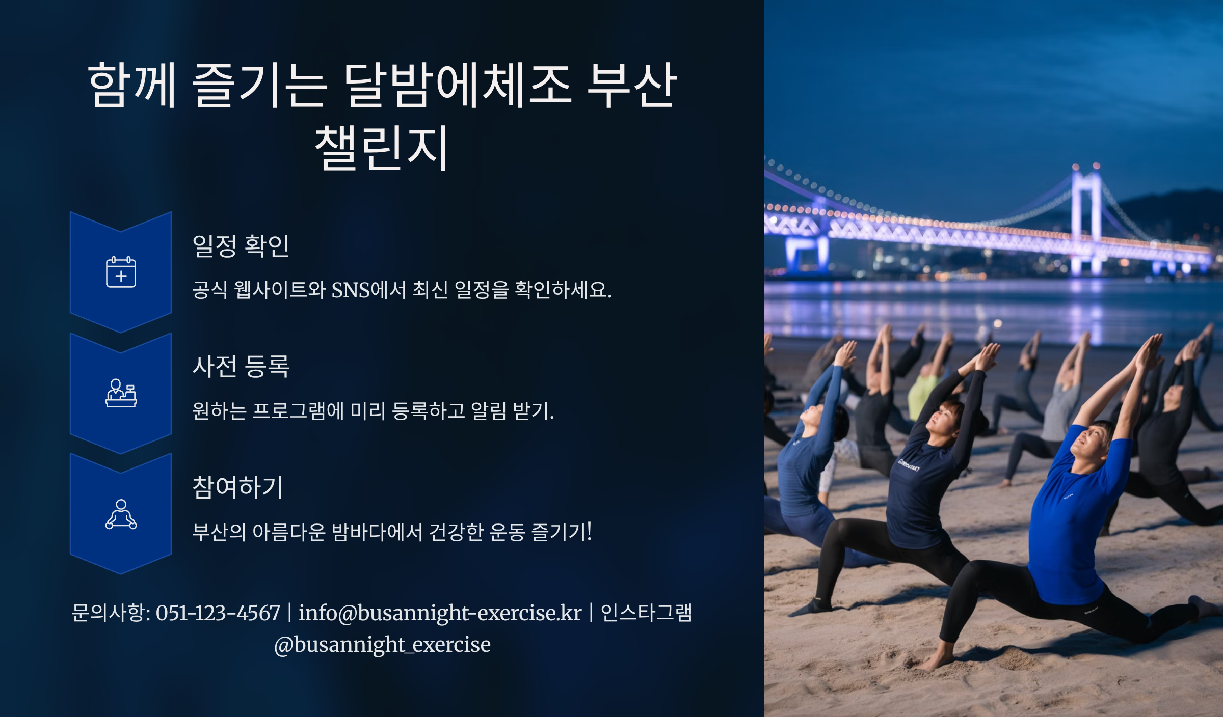 코스별로 운영되는 시간과 출발 지점이 다를 수 있으므로, 챌린지 참가 전 미리 확인해야 합니다. 특히, 야간에 진행되는 만큼 어두운 구간에서는 안전을 위해 밝은 옷을 입거나 소형 랜턴을 지참하는 것이 좋습니다. 챌린지 코스는 부산의 주요 관광 명소를 포함하고 있어, 챌린지 후 주변 맛집이나 카페를 방문하는 것도 좋은 경험이 될 수 있습니다. 이처럼 **달밤에체조 부산 챌린지**는 단순한 운동을 넘어, 도시를 탐험하고 즐길 수 있는 기회를 제공합니다.