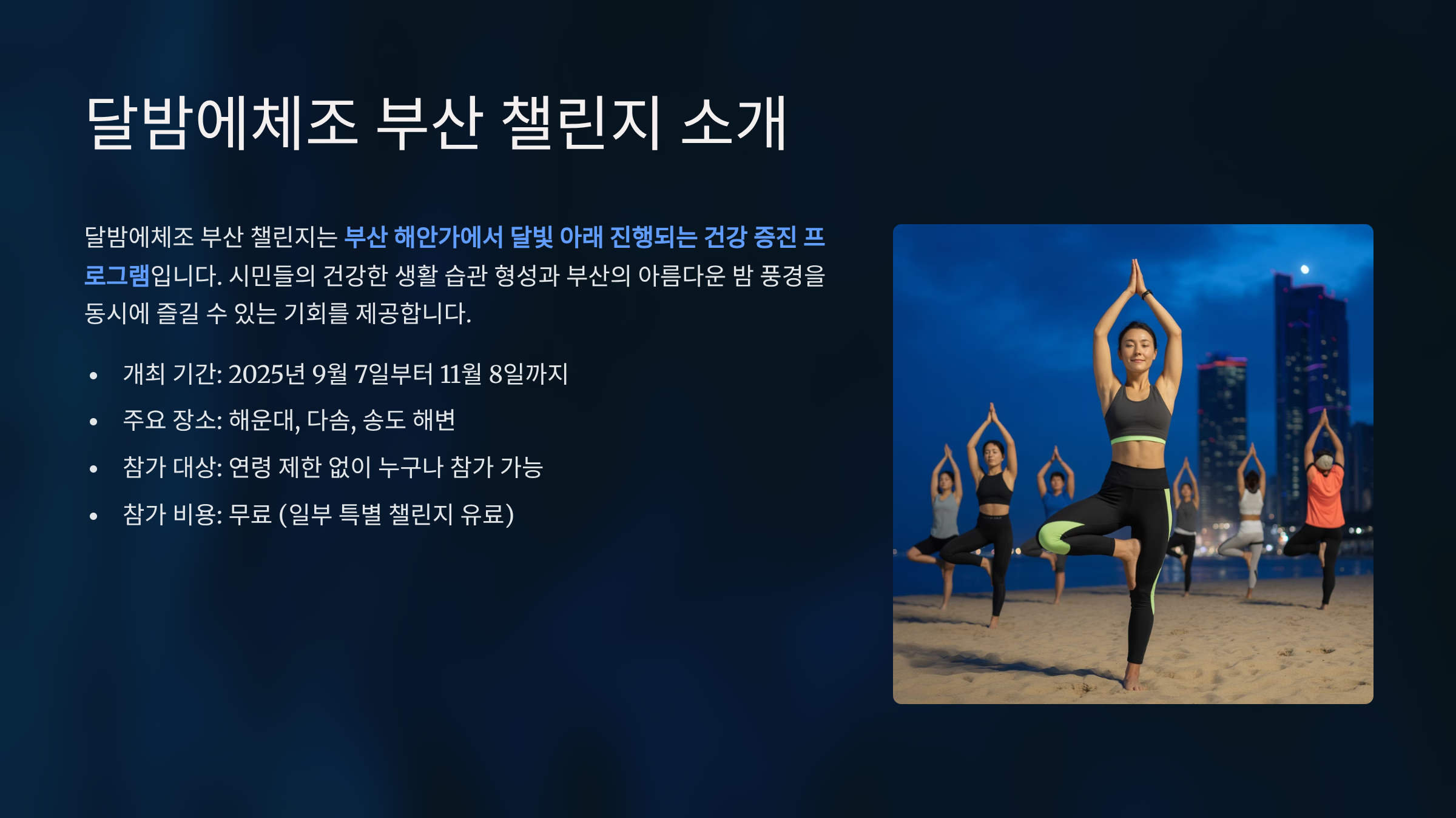 **달밤에체조 부산 챌린지**는 부산 시민들의 건강 증진과 야간 활동을 독려하기 위해 기획된 특별한 걷기·달리기 챌린지입니다. 해 질 녘부터 밤까지 이어지는 이 챌린지는 아름다운 부산의 야경을 배경으로 건강과 즐거움을 동시에 챙길 수 있는 기회를 제공합니다. 단순히 걷거나 뛰는 것을 넘어, 부산의 주요 명소를 코스로 포함시켜 참가자들이 도시의 매력을 새롭게 발견할 수 있도록 구성되어 있습니다. 내가 생각했을 때, 이 챌린지는 단순한 스포츠 이벤트가 아닌, 도시의 활력을 불어넣는 문화 행사로 자리 잡을 것입니다. 공식 출처인 **부산광역시 공식 홈페이지**를 참고하여 작성했습니다.