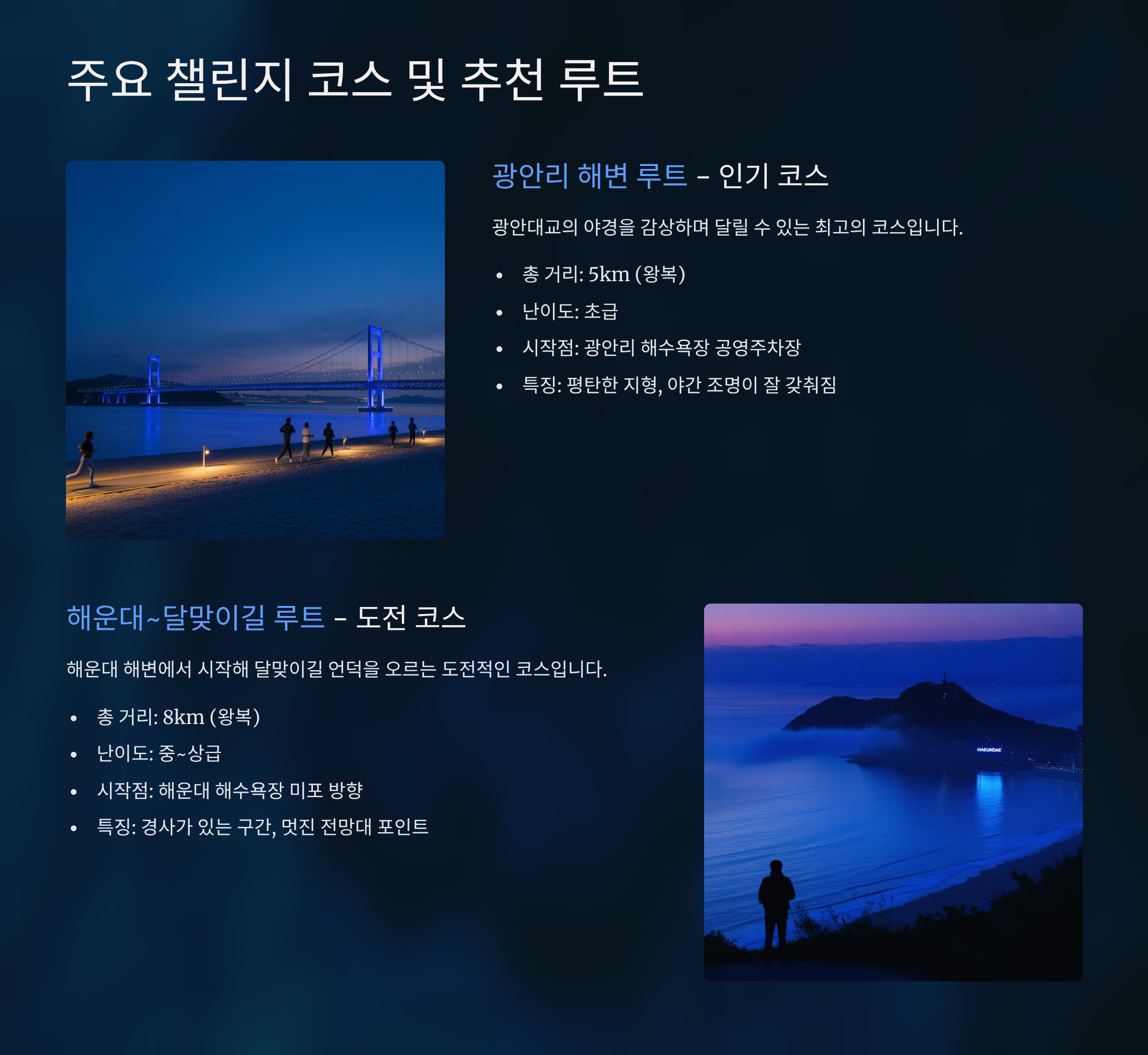 | 해운대-광안리 코스 | 약 5km | 해안 야경, 평탄한 지형 |
