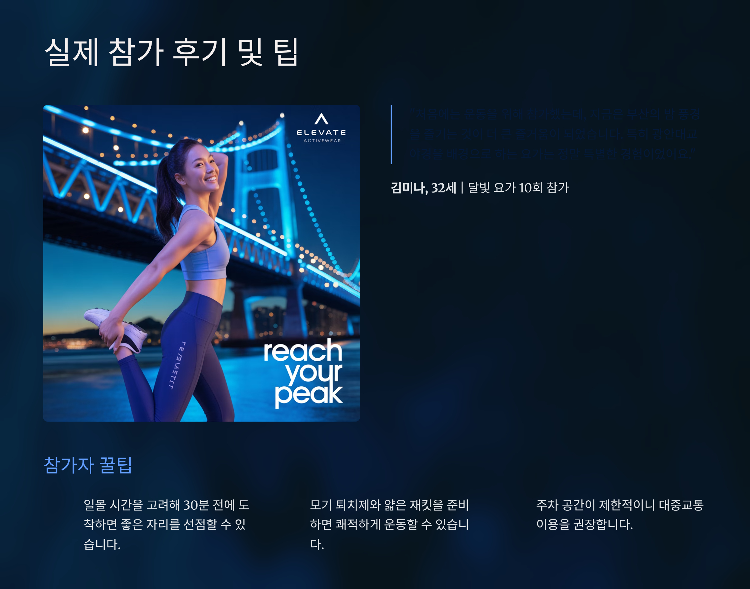 **달밤에체조 부산 챌린지**에 실제로 참가했던 사람들의 후기를 들어보면, 대부분 긍정적인 반응을 보입니다. 참가자들은 특히 부산의 아름다운 야경을 배경으로 운동할 수 있다는 점에 큰 만족감을 표현했습니다. "밤에 뛰는 것은 처음인데, 시원한 바람과 함께 멋진 풍경을 보니 힘든 줄 모르고 완주했어요!"와 같은 후기는 이 챌린지의 매력을 잘 보여줍니다. 또한, 혼자 참가하는 사람들도 많아 부담 없이 즐길 수 있었다는 후기도 많습니다. 친구나 연인과 함께 참여한 사람들은 "함께 걷고 이야기하며 소중한 추억을 만들었다"고 말하며, 이 챌린지가 단순한 운동 행사를 넘어 관계를 돈독히 하는 기회가 되었다고 평가했습니다. 참가자들이 추천하는 몇 가지 꿀팁을 정리하면 다음과 같습니다.