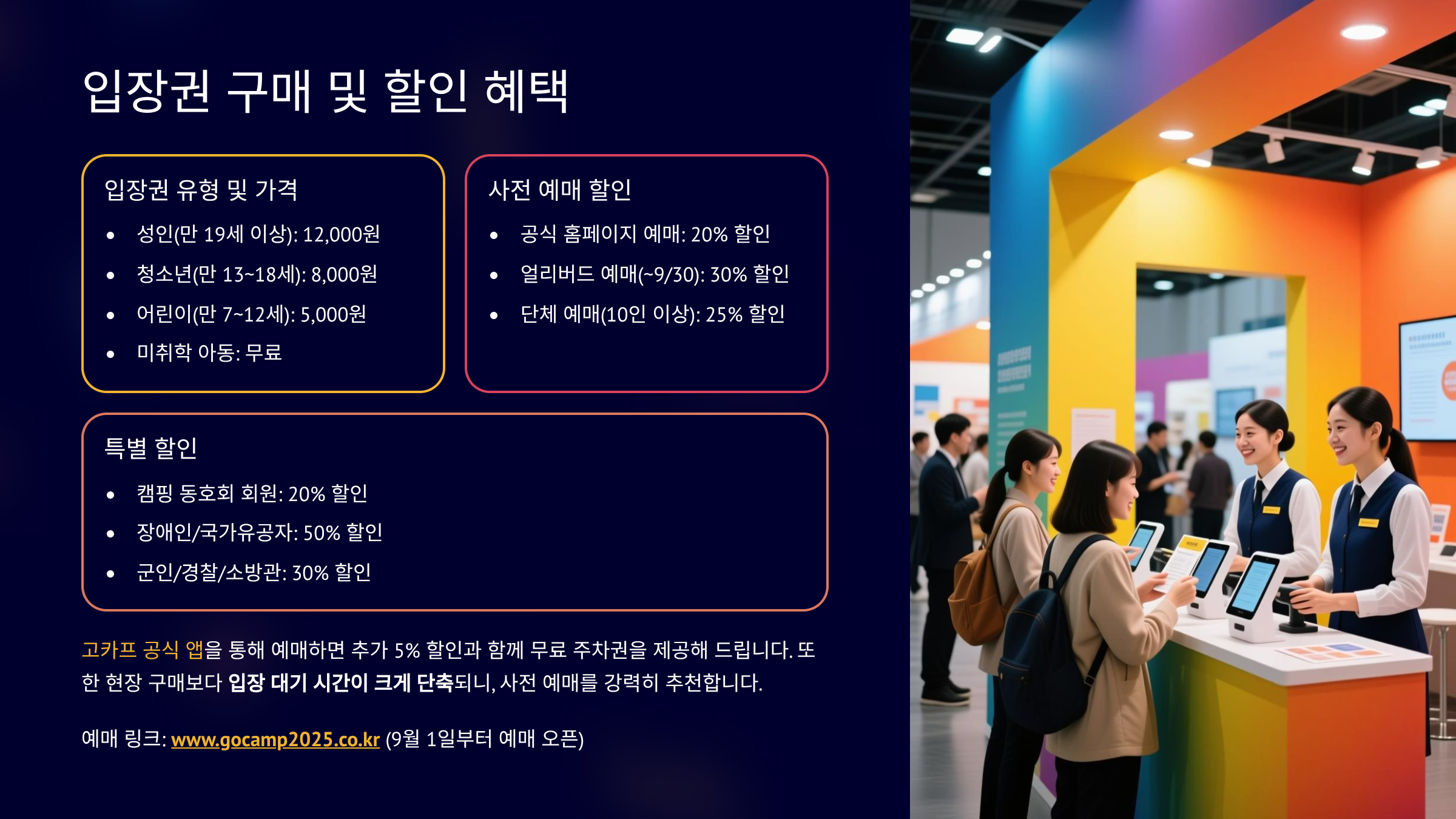 공식 홈페이지 가기고카프는 다양한 할인 혜택도 제공합니다. 고카프 공식 홈페이지에서 제공하는 초대권 또는 할인권을 소지한 경우 할인을 받을 수 있으며, 참가 브랜드 부스에서 받을 수 있는 할인권도 활용할 수 있습니다. 또한, 초등학생 이하 어린이와 65세 이상, 장애인, 국가유공자 등은 증빙 서류를 지참하면 무료 입장이 가능하니 해당되는 분들은 신분증이나 관련 서류를 꼭 챙겨가시기 바랍니다. 이러한 다양한 혜택을 잘 활용하면 더욱 저렴하게 고카프를 즐길 수 있습니다.