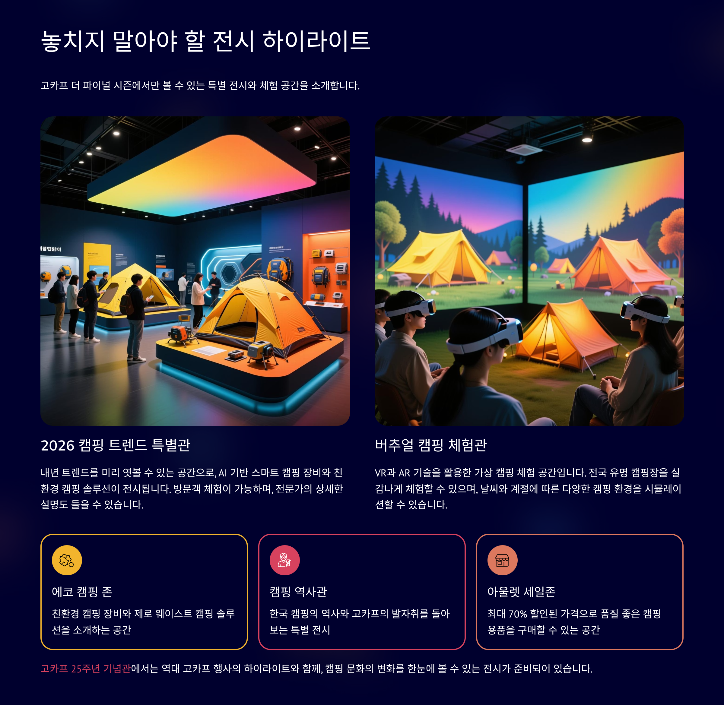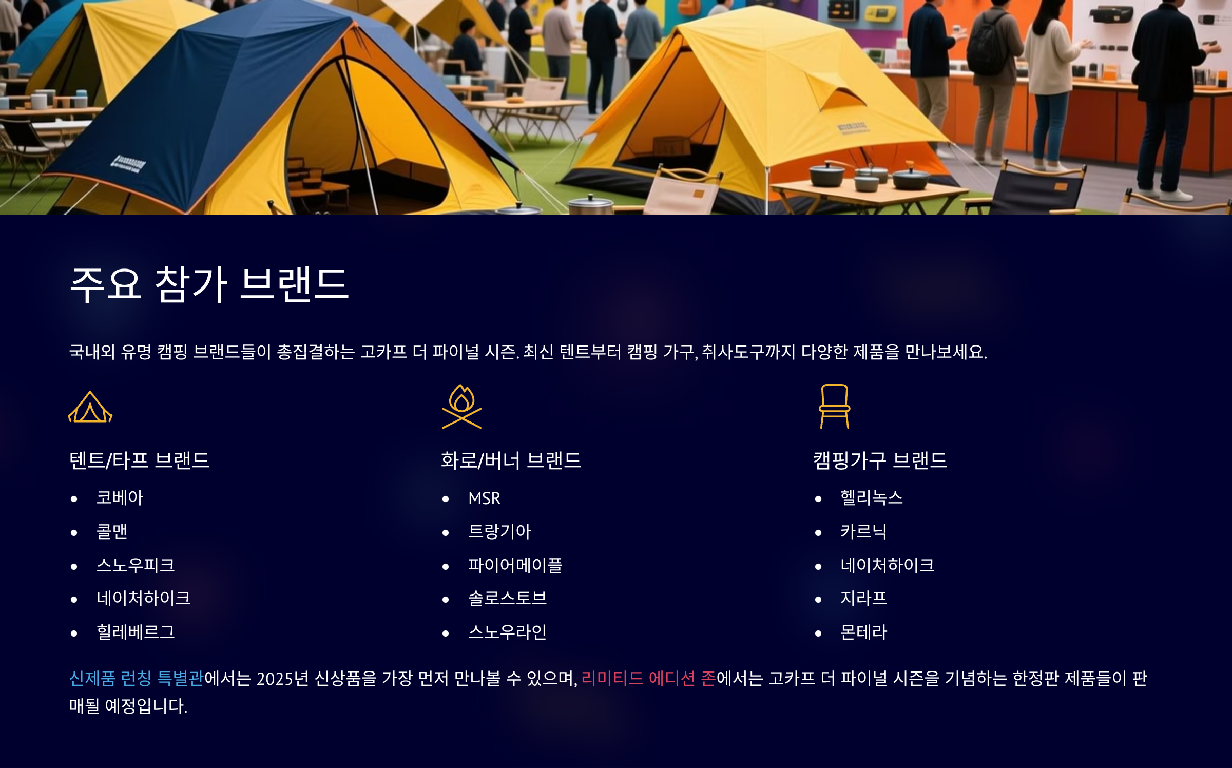 | 동계 캠핑 특별관 | 난방 용품, 방한 의류 등 동계 캠핑 필수 아이템 전시 |