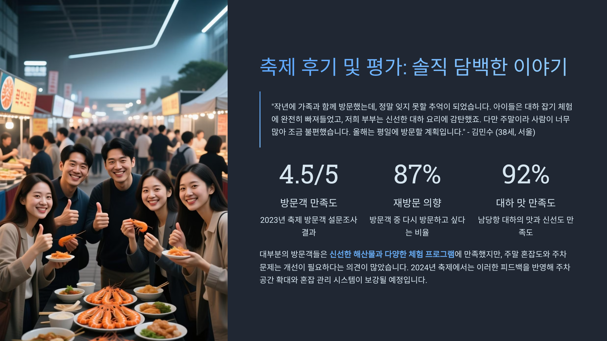 홍성 남당항 대하축제를 다녀온 사람들의 솔직한 후기를 종합해 보았습니다. 대부분의 방문객들은 "싱싱하고 맛있는 대하를 저렴하게 즐길 수 있어 좋았다"는 긍정적인 평가를 내렸습니다. 특히, 직접 횟집에서 대하를 골라 먹는 방식에 만족감을 표하는 후기가 많았고, 대하 소금구이는 "인생 새우"라는 극찬을 받기도 했습니다. 반면, 주말의 극심한 교통체증과 주차난에 대한 불만은 매년 반복되는 고질적인 문제로 지적됩니다. 또한, 축제장 내 바가지 요금에 대한 우려도 일부 존재하지만, 대부분의 상인들이 정찰제를 시행하고 있어 큰 문제는 없었습니다. 2025년에는 주최 측이 이러한 문제점을 보완하기 위해 교통 관리와 서비스 품질 향상에 더 많은 노력을 기울일 것으로 예상됩니다. 🗣️