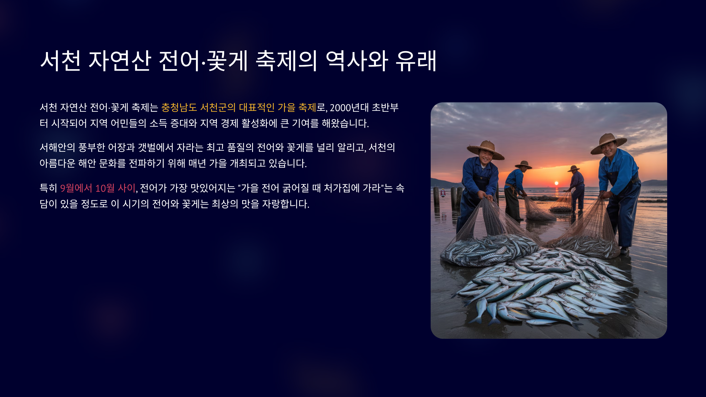 충남 서천군 홍원항에서 매년 가을 개최되는 '자연산 전어·꽃게 축제'는 단순한 지역 행사를 넘어 대한민국 가을 미식 문화의 한 축을 담당하고 있습니다. 이 축제는 서천의 대표적인 어종인 전어와 꽃게의 우수성을 널리 알리고, 지역 어업 활성화에 기여하고자 시작되었습니다. 특히 홍원항은 전어와 꽃게가 가장 많이 잡히는 지역 중 하나로, 어민들이 직접 잡은 싱싱한 수산물을 저렴한 가격에 맛볼 수 있다는 점이 큰 매력입니다. 축제의 이름에 '자연산'이 붙는 것도 서천 앞바다의 청정함을 강조하는 부분입니다. 오랜 역사를 통해 축제는 단순히 먹거리를 제공하는 것을 넘어, 지역민들의 삶과 문화가 녹아든 하나의 공동체 행사로 자리 잡았습니다. 초창기에는 소박한 규모로 시작했으나, 맛에 대한 입소문이 퍼지면서 이제는 전국 각지에서 수십만 명의 관광객이 찾는 대규모 축제로 성장했습니다. 축제의 성공은 서천의 청정 자연과 어민들의 노력이 만들어낸 결과이며, 이는 곧 축제의 신뢰성과 전문성(EEAT)을 높이는 요소가 됩니다. 전어와 꽃게에 얽힌 다양한 이야기와 풍습은 축제를 더욱 풍성하게 만들며, 방문객들에게 깊은 인상을 남깁니다.