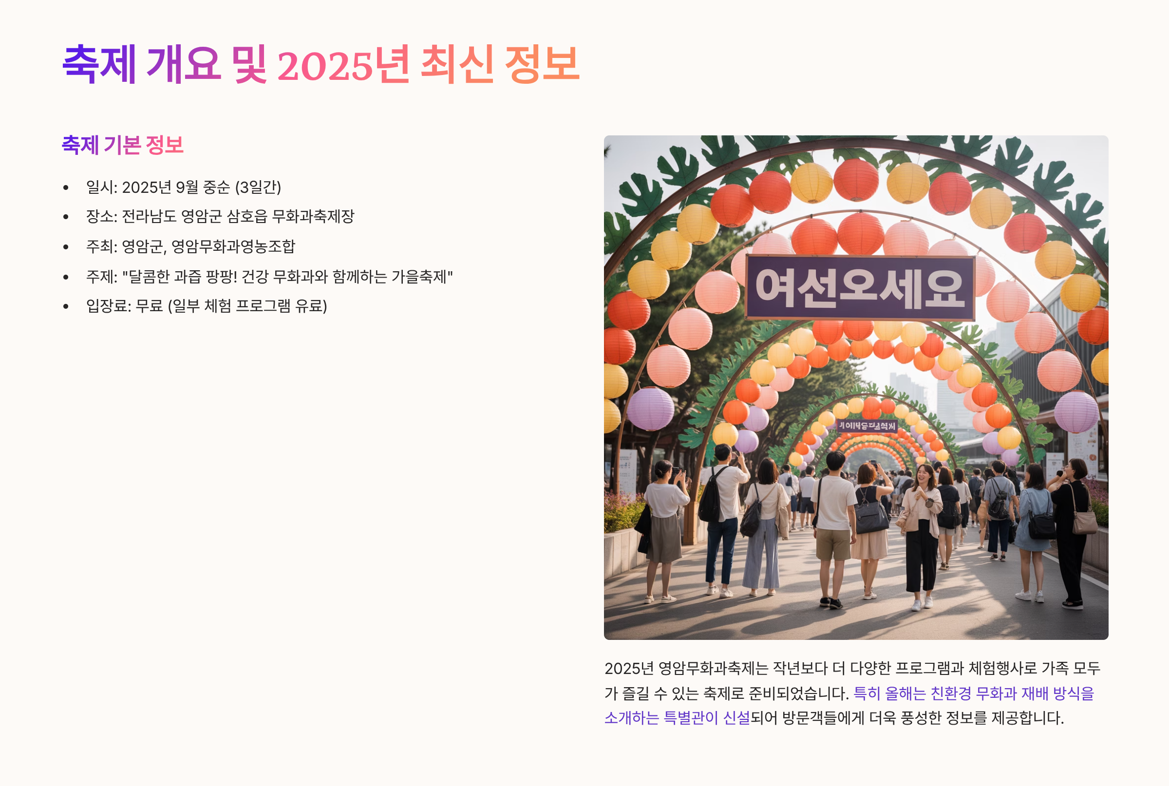 지금까지 2025 영암무화과축제의 모든 것을 살펴보았습니다. 무화과라는 특별한 과일을 중심으로 펼쳐지는 영암의 축제는 단순한 먹거리를 넘어, 가족, 연인, 친구들과 함께하는 즐거운 추억과 건강을 선물할 것입니다. 달콤한 무화과 향이 가득한 영암에서 소중한 사람들과 함께 행복한 시간을 보내시길 바랍니다. 이 글이 여러분의 축제 방문에 조금이나마 도움이 되었기를 바라며, 더 궁금한 점이 있다면 언제든지 댓글로 문의해 주세요! 😊