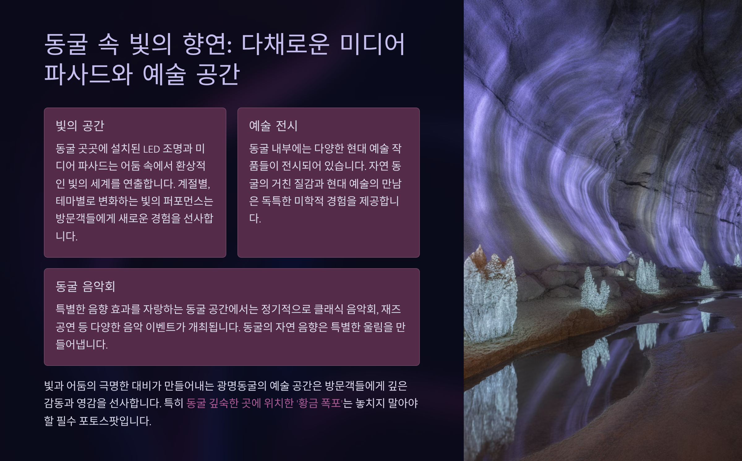 ⚠️ 주의하세요! 동굴 예술의 전당 공연 일정은 계절이나 내부 사정에 따라 변경될 수 있으니, 방문 전 반드시 공식 홈페이지를 통해 확인하는 것이 좋습니다.