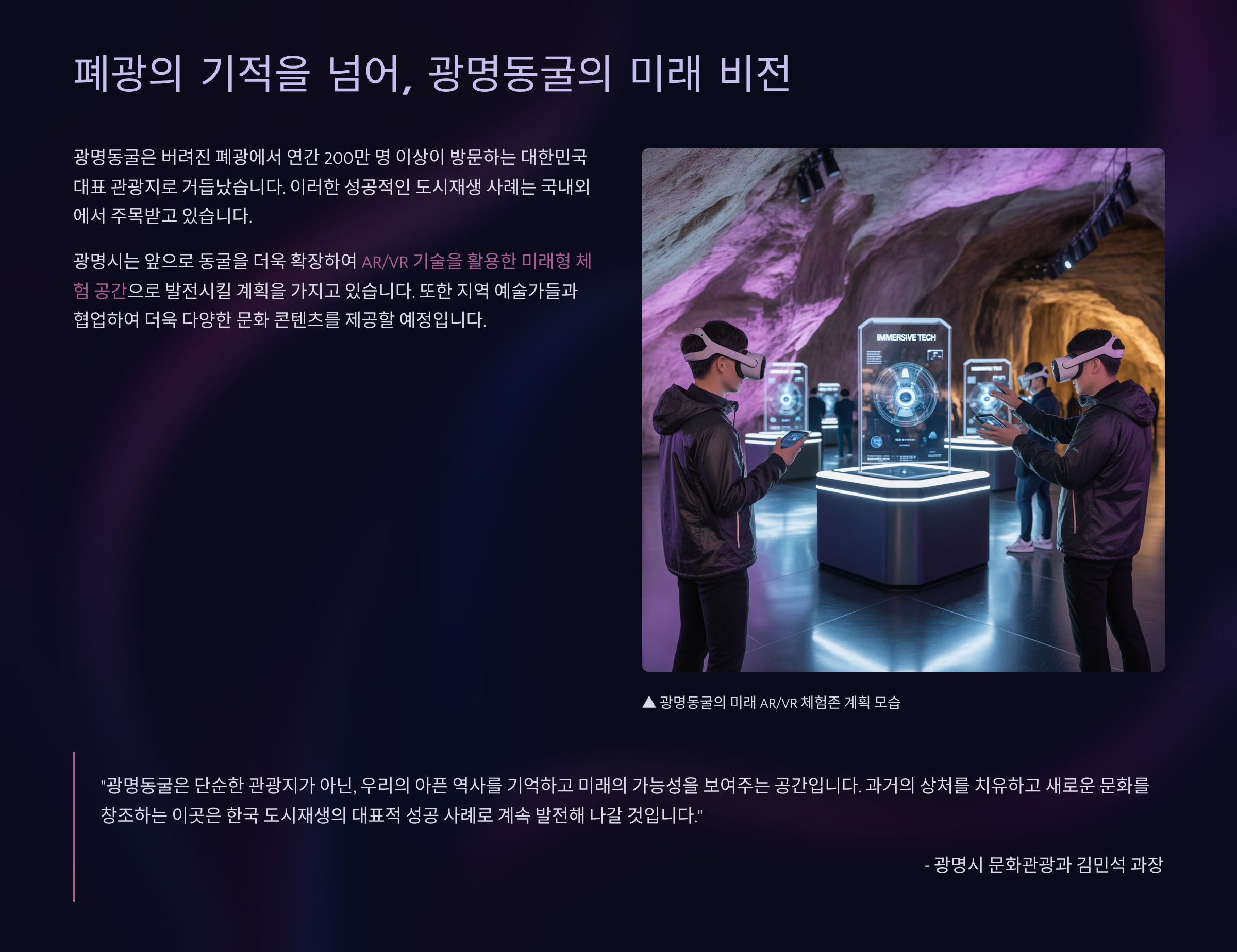 광명동굴은 단순한 관광지를 넘어, 미래를 선도하는 도시 재생의 롤모델을 제시하고 있습니다.