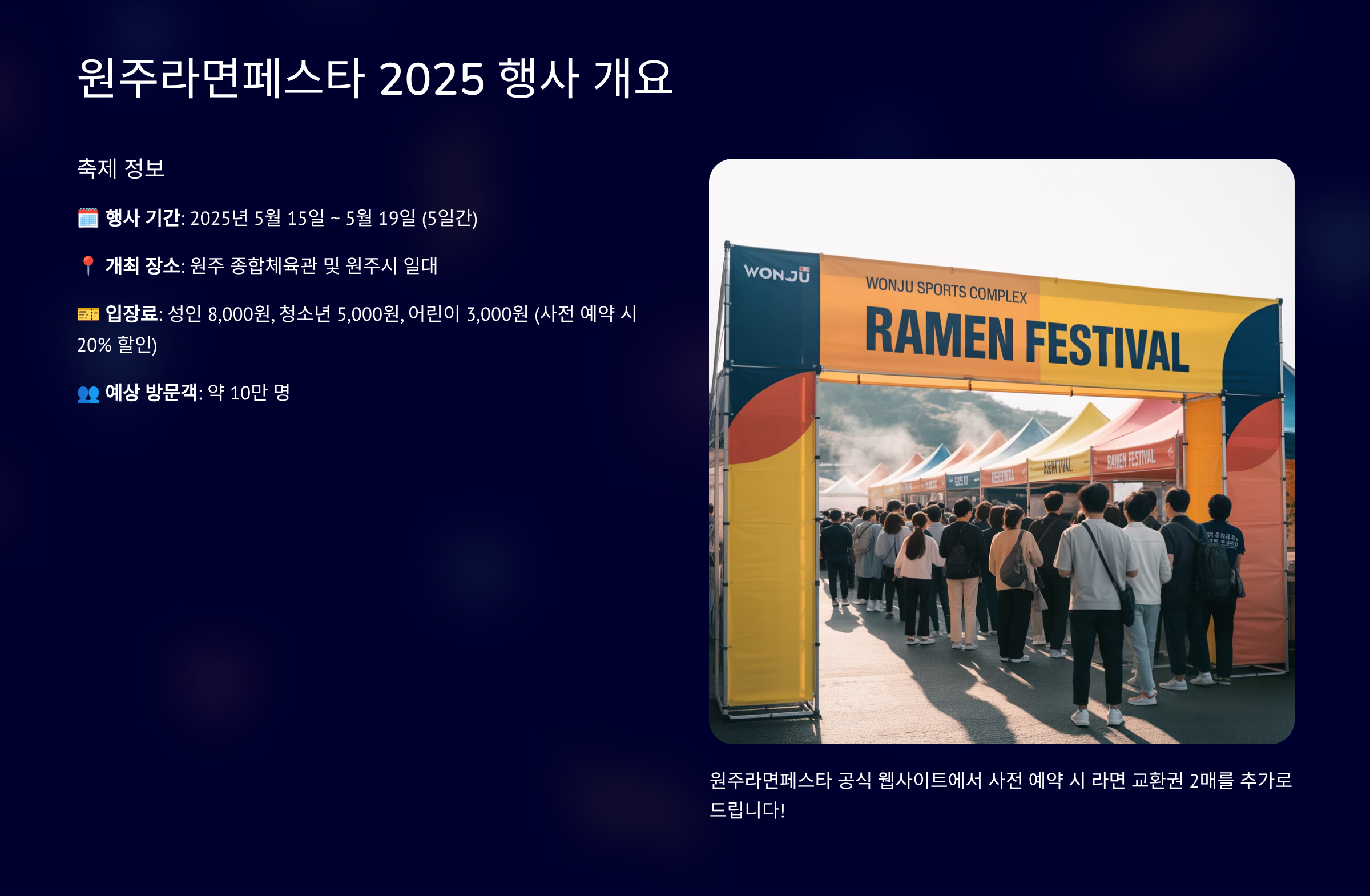 이 글은 원주라면페스타에 대한 일반적인 정보를 제공하는 것을 목적으로 작성되었으며, 행사 주최 측의 공식 발표나 최신 정보와 차이가 있을 수 있습니다. 행사 일정, 프로그램, 참여 업체 등은 주최 측 사정에 따라 변경될 수 있으므로, 방문 전에 반드시 공식 홈페이지나 관련 채널을 통해 최종 정보를 확인하시기 바랍니다. 본 정보로 인한 직간접적 손해에 대해 어떠한 법적 책임도 지지 않습니다.