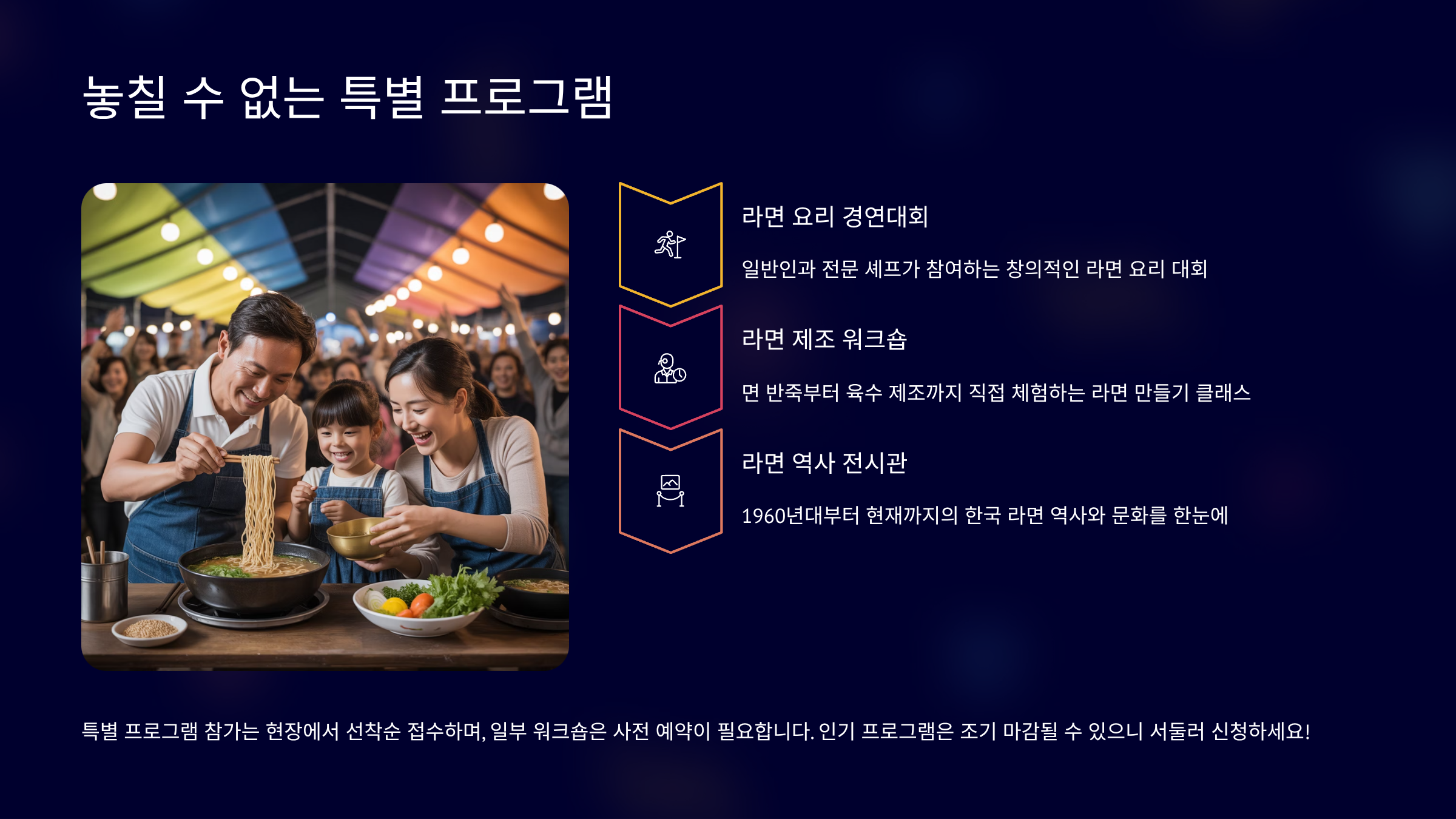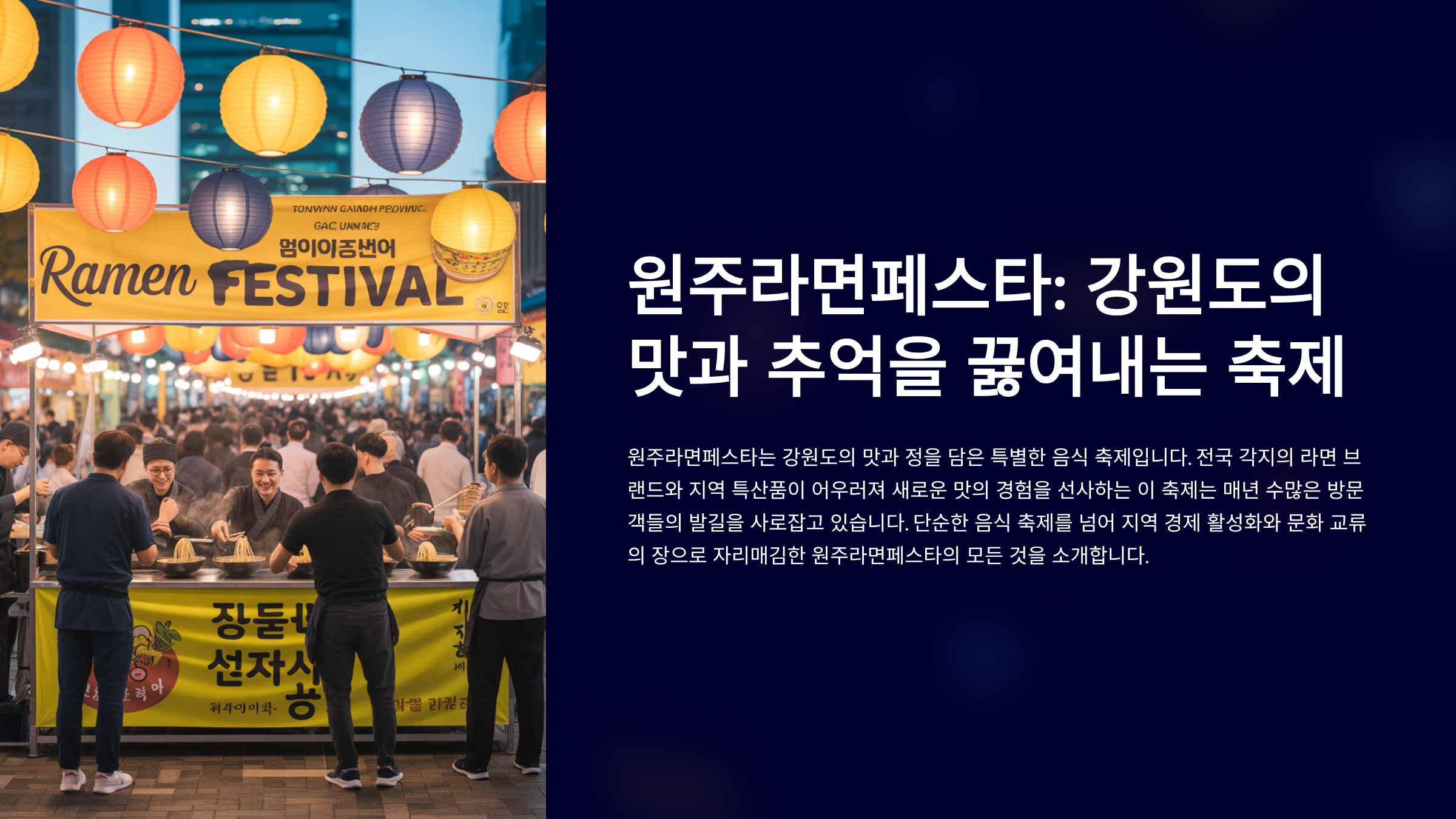 라면은 배고픈 시절의 허기를 달래주던 추억의 음식이었고, 바쁜 일상 속에서 간편하게 즐기는 현대인의 소울푸드입니다. 원주라면페스타는 바로 이 라면 한 그릇에 담긴 다양한 이야기를 모두와 함께 나누고자 하는 마음에서 시작되었습니다. 축제 기간 동안, 사랑하는 사람들과 함께 라면을 끓여 먹고, 새로운 맛에 도전하며, 즐거운 음악에 맞춰 몸을 흔드는 모든 순간들이 소중한 추억으로 남을 것입니다. 라면은 우리에게 익숙한 일상이지만, 축제라는 특별한 공간에서 만나는 라면은 분명 새로운 감동을 선사할 것입니다. 쌀쌀한 가을, 따뜻한 라면 한 그릇처럼 우리의 마음을 훈훈하게 채워줄 원주 라면 페스타에서 맛과 추억, 그리고 행복을 마음껏 끓여보세요. 이 글이 여러분의 완벽한 축제 경험에 도움이 되기를 바랍니다. 더 궁금한 점이 있다면 언제든지 댓글로 물어봐주세요! 😊