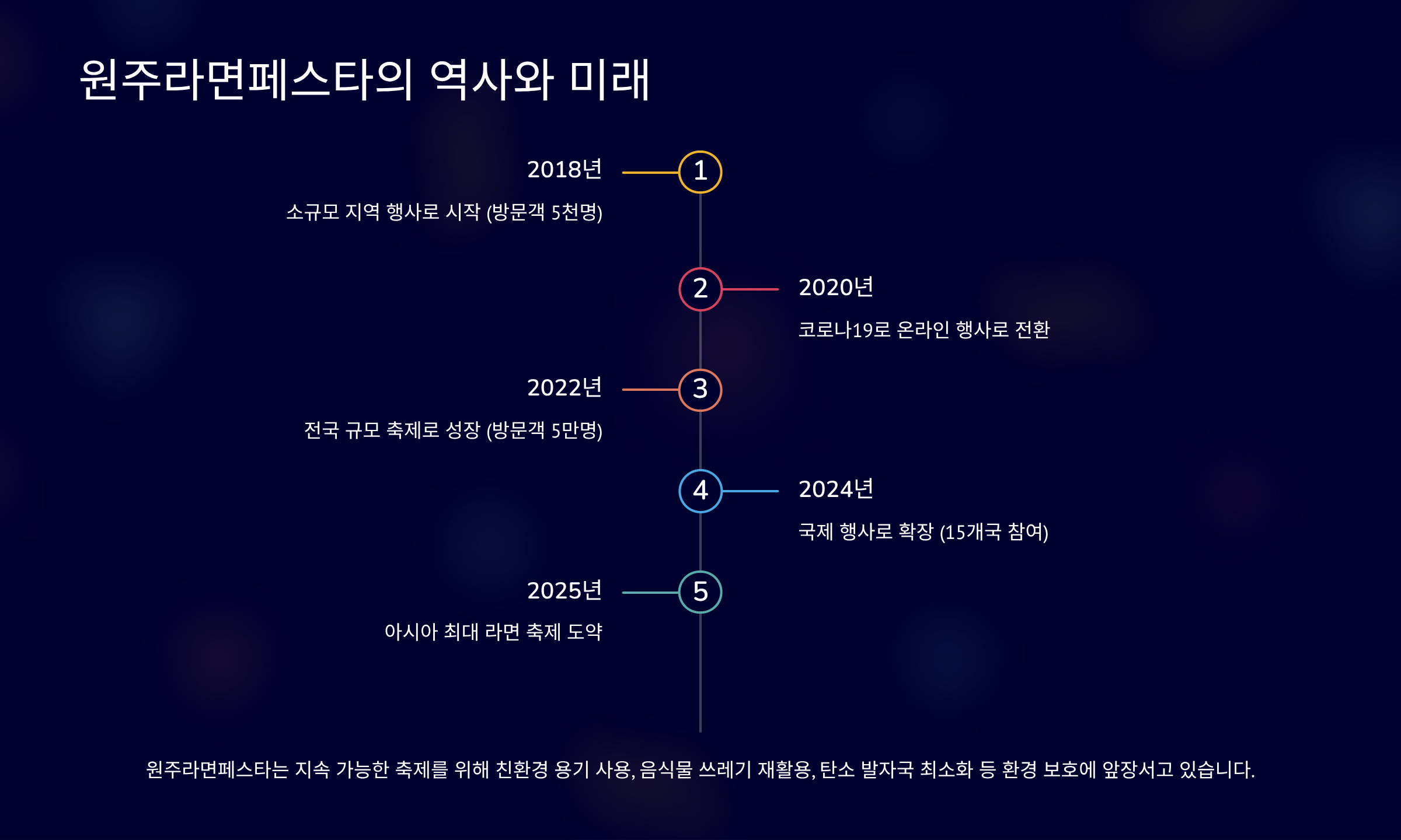원주 라면 페스타는 2022년 첫 개최 이후 매년 꾸준한 성장을 거듭하며 지역을 대표하는 축제로 자리 잡았습니다. 첫 회에는 소규모로 시작했지만, 라면이라는 보편적인 소재와 흥미로운 콘텐츠로 입소문을 타면서 매년 방문객 수가 폭발적으로 증가했습니다. 특히, 2024년에는 외국인 방문객 비율이 전년 대비 20% 이상 증가하며 글로벌 축제로의 가능성을 보여주기도 했습니다. 이러한 성공을 바탕으로 올해는 더욱 확장된 규모와 프로그램으로 방문객들을 맞이할 준비를 마쳤습니다. 앞으로 원주 라면 페스타는 단순히 라면을 소개하는 것을 넘어, K-푸드의 한 축으로서 라면의 역사와 문화를 전 세계에 알리는 교두보 역할을 수행하고자 합니다. 지속 가능한 축제를 위해 환경 보호 캠페인을 강화하고, 푸드 트럭 운영 시 친환경 용기 사용을 의무화하는 등 사회적 책임에도 적극적으로 임할 것입니다. 또한, 라면 산업 관계자들과의 협력을 통해 라면 산업의 최신 트렌드를 공유하고, 새로운 비즈니스 기회를 창출하는 '라면 산업 컨퍼런스' 개최도 장기적인 목표로 검토하고 있습니다. 이처럼 원주 라면 페스타는 과거의 성공에 안주하지 않고, 끊임없이 진화하며 미래를 향해 나아가고 있습니다.