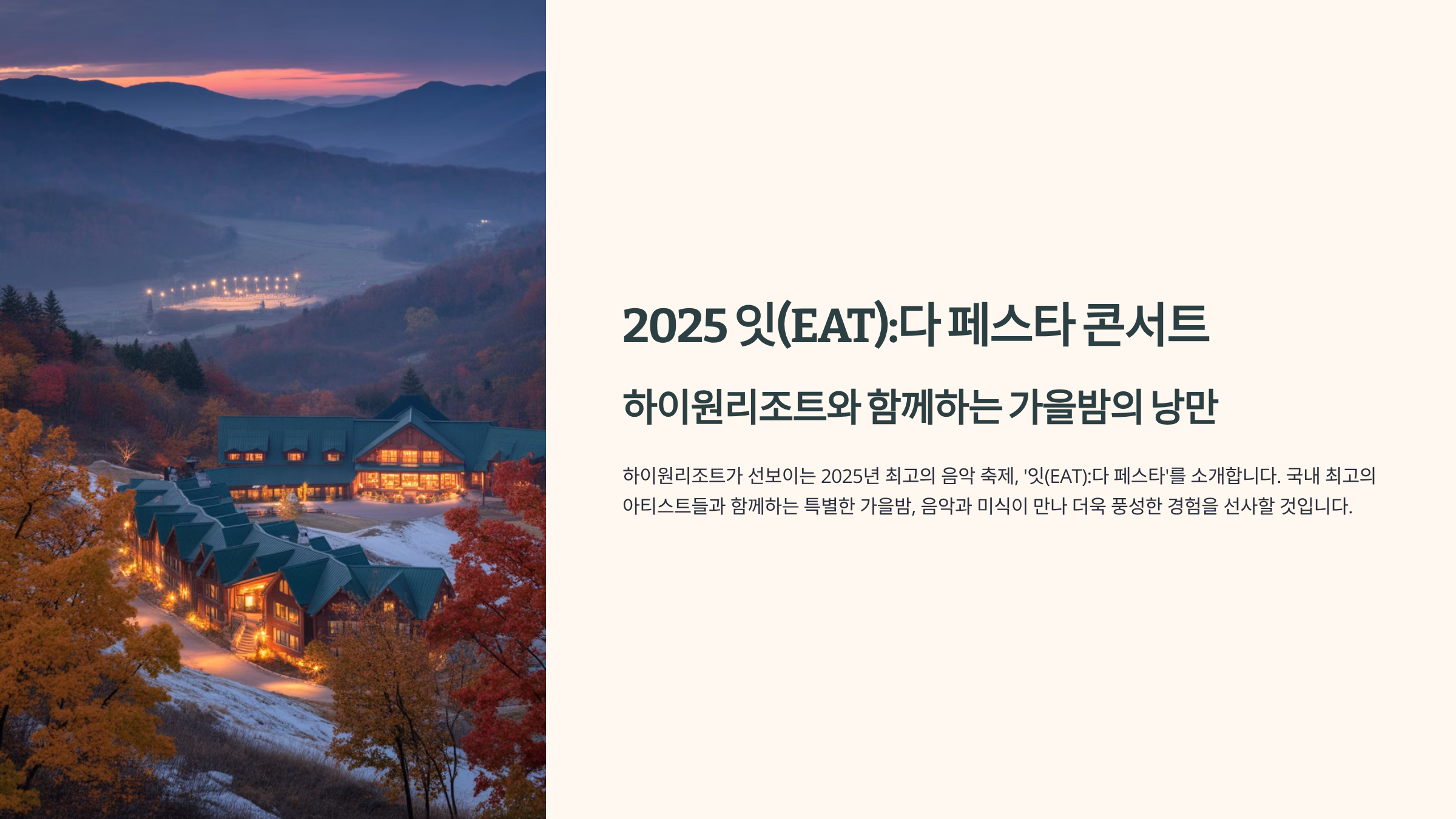 강원도 정선의 아름다운 자연 속에 자리한 하이원리조트에서 올가을, 잊지 못할 음악 축제가 열립니다. 바로 '2025 잇(EAT):다 페스타 콘서트'인데요. 이 행사는 단순히 음악 공연을 넘어, 맛있는 음식과 다채로운 체험 프로그램이 어우러진 종합 문화 축제입니다. 특히, 대중성과 음악성을 겸비한 국내 최정상급 아티스트들의 출연 소식은 벌써부터 많은 기대를 모으고 있습니다. 가을밤의 선선한 공기와 함께 아름다운 멜로디를 만끽하고, 가족, 연인, 친구와 함께 특별한 추억을 만들 수 있는 절호의 기회입니다. 이번 글에서는 '2025 하이원리조트 잇(EAT):다 페스타 콘서트'의 모든 것을 상세하게 알려드리고, 더욱 즐겁게 축제를 만끽할 수 있는 실용적인 팁들을 제공해 드리겠습니다. 지금부터 함께 떠나볼까요?