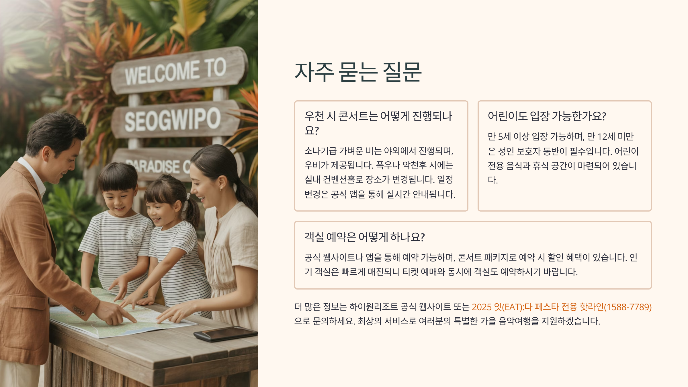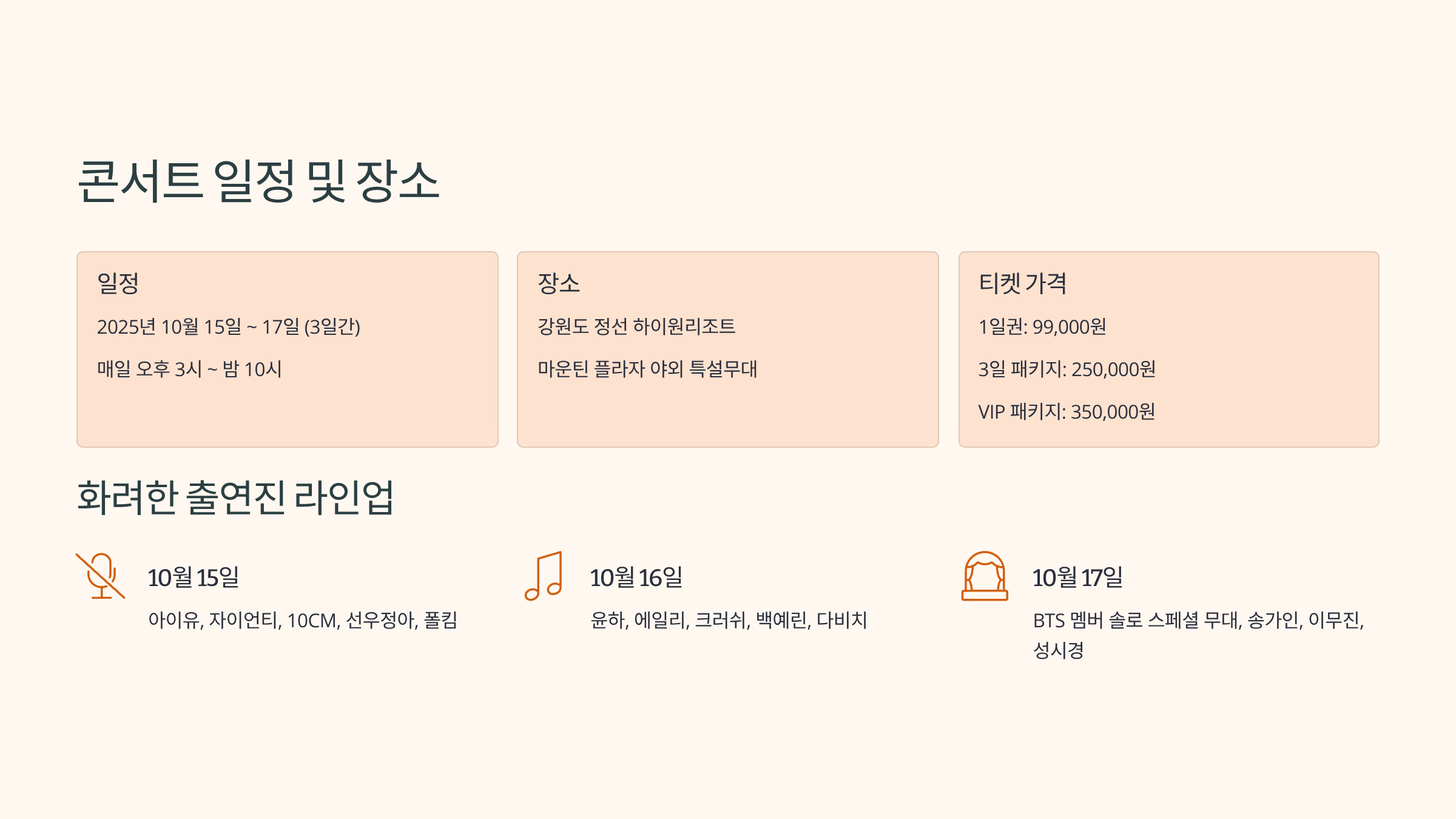 이 글은 '2025 잇(EAT):다 페스타 콘서트'에 대한 일반적인 정보를 제공하며, 주최 측의 공식 발표나 규정을 대체할 수 없습니다. 행사 일정, 출연진, 부대 행사 등은 주최 측의 사정에 따라 변동될 수 있습니다. 방문 전 반드시 하이원리조트 공식 홈페이지나 관련 공지사항을 확인하시기 바랍니다. 본 정보로 인한 직간접적 손해에 대해 어떠한 법적 책임도 지지 않습니다.