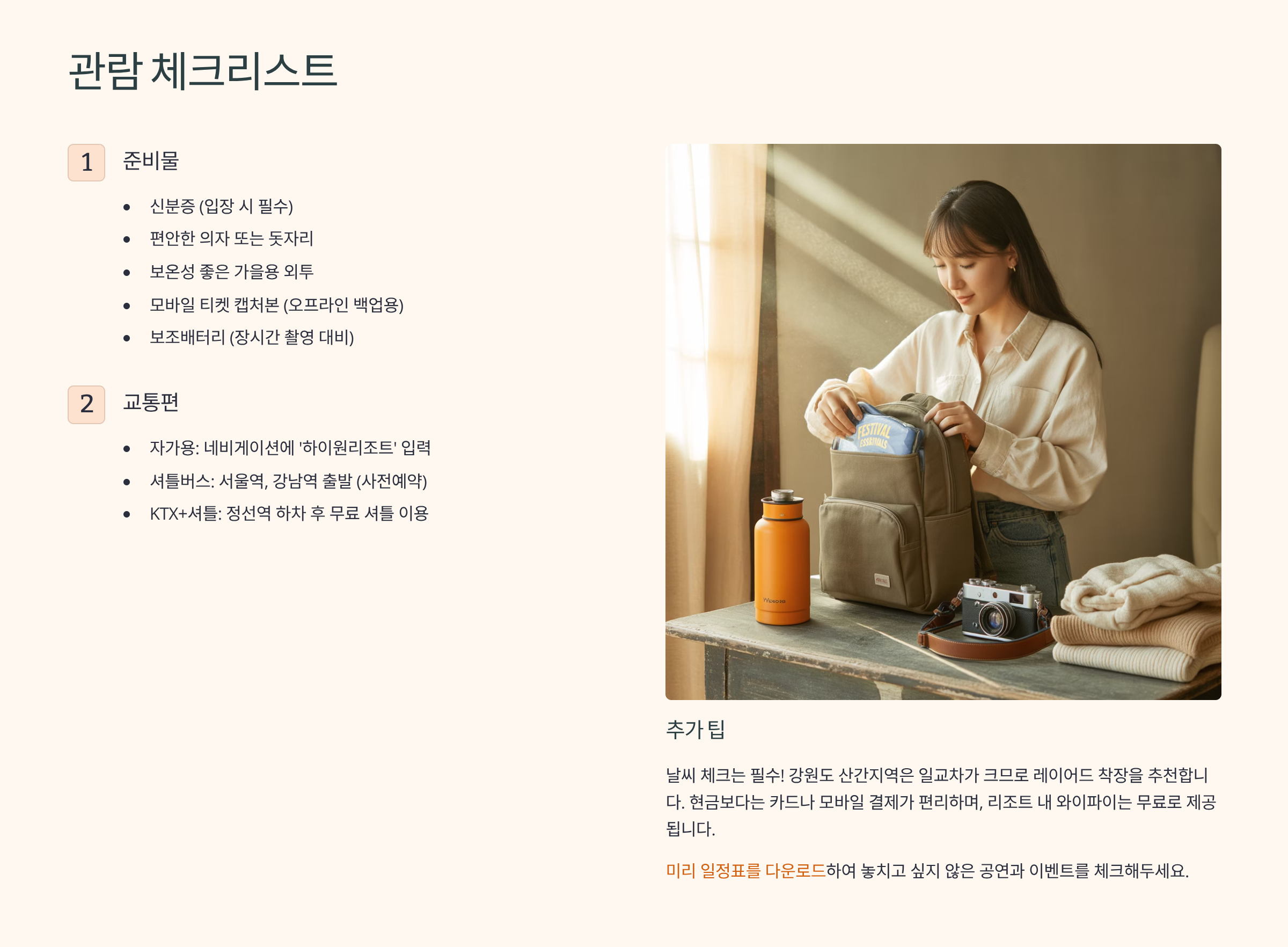 성공적인 '2025 잇(EAT):다 페스타 콘서트' 관람을 위해 마지막으로 몇 가지를 체크해 보세요. 첫째, 날씨 확인은 필수입니다. 야외에서 진행되는 만큼, 혹시 모를 비에 대비해 우산을 챙기는 것도 좋은 방법입니다. 둘째, 편안한 신발을 착용하세요. 넓은 잔디밭을 이동하고 서서 관람할 수 있으니 발이 편한 운동화가 가장 좋습니다. 셋째, 개인 소지품을 보관할 수 있는 작은 가방을 준비하세요. 돗자리와 겉옷, 간식 등을 챙기면 더욱 쾌적하게 축제를 즐길 수 있습니다. 마지막으로, 휴대폰 배터리 충전은 잊지 마세요! 아름다운 풍경과 멋진 공연을 사진과 영상으로 남기려면 충분한 배터리 용량이 필요합니다. 이 모든 준비를 마쳤다면, 이제 하이원리조트로 떠나 최고의 가을밤을 만끽할 준비가 된 것입니다. 가족, 연인, 친구들과 함께 소중한 추억을 만들어보세요. 행복하고 즐거운 시간이 되기를 바랍니다.