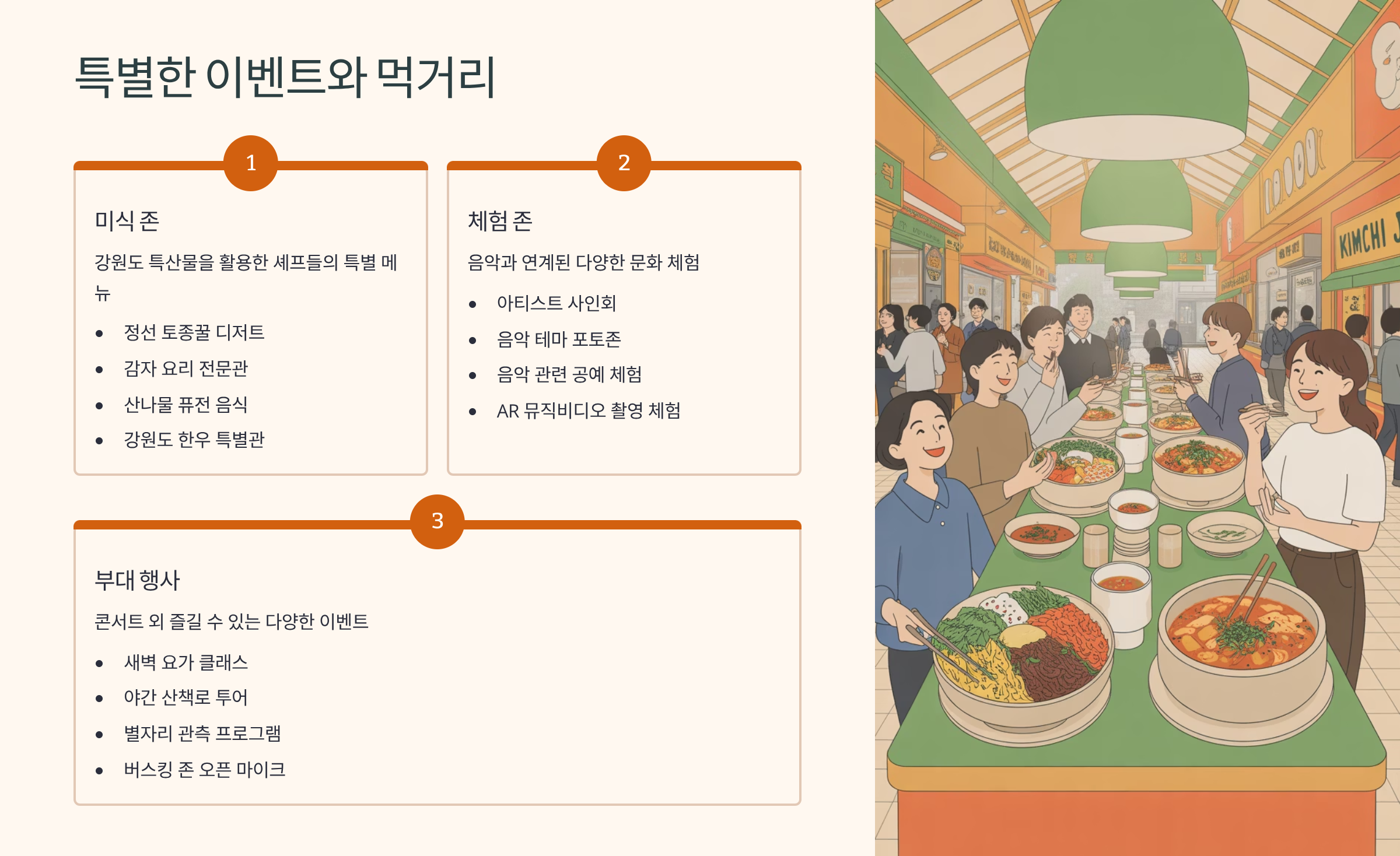 이번 '2025 잇(EAT):다 페스타'는 콘서트 외에도 다채로운 부대 행사를 마련하여 방문객들에게 즐거움을 선사할 예정입니다. 특히, '잇(EAT):다'라는 이름에 걸맞게 다양한 먹거리와 요리 경연대회가 눈길을 끕니다. 정선 지역의 특산물을 활용한 맛집 요리 경연과 가족 요리대회가 열려 미식가들의 입맛을 자극할 것입니다. 현장에서 직접 조리한 신선하고 맛있는 음식을 맛볼 수 있는 기회는 흔치 않습니다. 또한, 낮 시간대에는 아이들이 좋아하는 다양한 체험 부스와 이벤트가 진행되어, 콘서트 시작 전부터 온 가족이 함께 즐길 수 있습니다. 다양한 음식 부스와 함께 시원한 음료를 판매하는 코너도 마련될 예정이니, 콘서트를 관람하며 맛있는 음식을 함께 즐기는 낭만적인 경험을 해보세요. 축제 현장에서 맛보는 특별한 요리와 함께라면, 콘서트의 감동이 배가 될 것입니다. 단, 현장 결제 방식은 미리 확인하고 가는 것이 좋습니다.