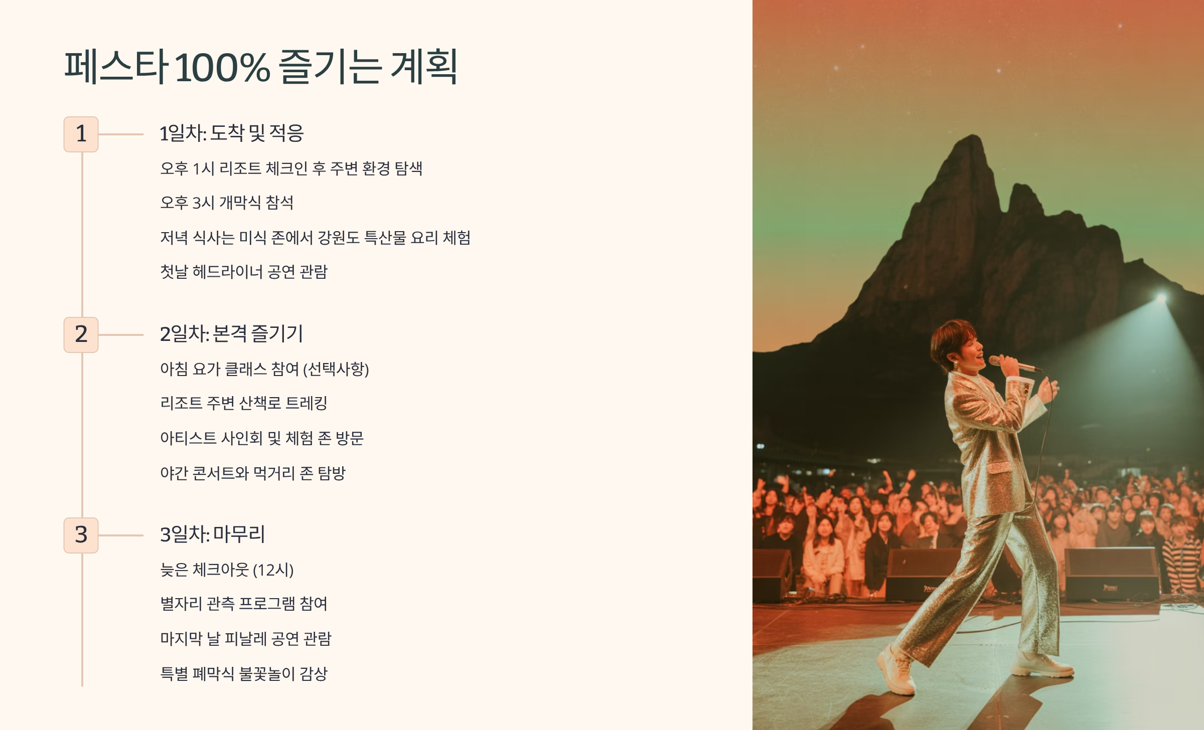 하이원리조트에서 '잇(EAT):다 페스타'를 제대로 즐기려면 미리 계획을 세우는 것이 중요합니다. 먼저, 콘서트가 시작되는 오후 6시보다 일찍 도착하여 잔디광장 주변의 먹거리 부스를 탐방하는 것을 추천합니다. 신선한 지역 특산물을 활용한 다양한 요리를 맛보며 낮부터 축제 분위기를 만끽할 수 있습니다. 특히, 인기 부스는 대기 줄이 길 수 있으니 서두르는 것이 좋습니다. 오후에는 가족과 함께 참여할 수 있는 요리대회나 체험 이벤트에 참여하여 특별한 추억을 만들어 보세요. 콘서트가 시작되면 준비해 온 돗자리에 앉아 편안하게 공연을 감상합니다. 좋아하는 아티스트의 노래를 따라 부르고, 가을밤의 낭만을 온몸으로 느껴보세요. 공연이 끝난 후에는 하이원리조트의 야경을 감상하며 하루를 마무리하는 것도 좋은 방법입니다. 1박 2일 일정으로 방문한다면, 다음 날 아침에는 곤돌라를 타고 하이원 스카이워크에 올라 정선의 아름다운 풍경을 감상하는 것도 추천합니다. 음악, 음식, 그리고 자연이 모두 어우러진 '잇(EAT):다 페스타'를 완벽하게 즐기기 위해서는 미리 동선을 짜고, 시간을 효율적으로 활용하는 것이 중요합니다.