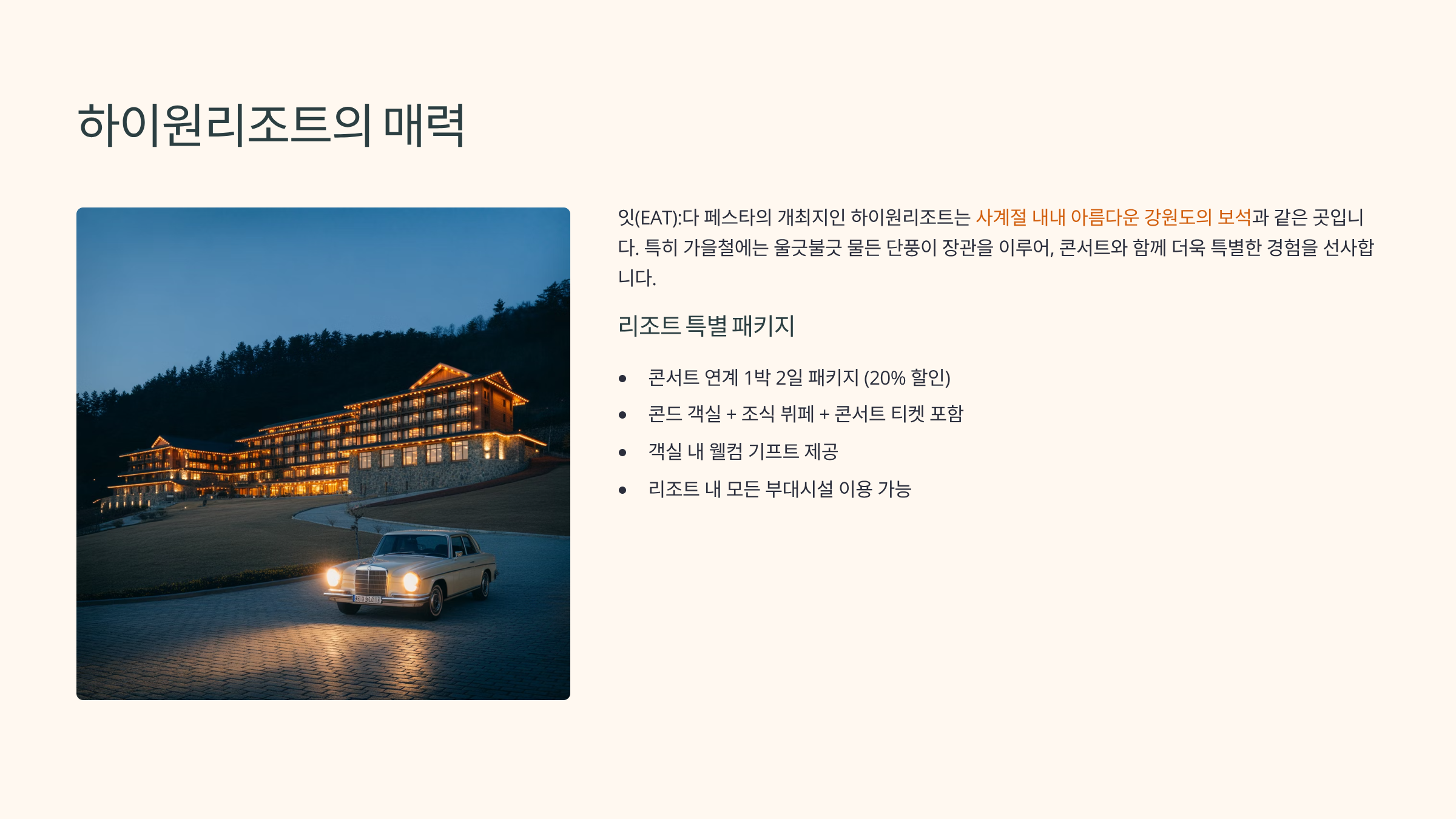 '잇(EAT):다 페스타'는 이름에서 알 수 있듯이 '먹고(EAT)', '즐기다(다)'의 의미를 담아 음악과 미식, 그리고 자연이 어우러진 복합 문화 축제입니다. 하이원리조트의 넓은 잔디광장에서 열리는 이번 콘서트는 단순한 관람형 공연이 아니라, 누구나 자유롭게 피크닉처럼 즐길 수 있도록 기획되었습니다. 특히, 지역 상생을 목표로 정선 특산물을 활용한 다양한 먹거리 부스가 운영되어, 음악을 들으며 지역의 맛을 경험할 수 있는 특별한 기회를 제공합니다. 콘서트 외에도 가족 단위 방문객을 위한 다양한 즐길 거리가 마련되어 있어, 어린아이부터 어르신까지 모든 세대가 함께 즐길 수 있는 것이 큰 특징입니다. 하이원리조트의 아름다운 자연경관과 함께 펼쳐지는 이번 축제는 도시의 답답함에서 벗어나 진정한 힐링을 선사할 것입니다. 낮부터 시작되는 다양한 체험 프로그램에 참여하고, 저녁에는 환상적인 콘서트를 감상하며 하루를 마무리하는 완벽한 가을 여행이 될 것입니다. 이번 행사를 통해 하이원리조트는 방문객들에게는 잊지 못할 추억을, 지역 사회에는 활력을 불어넣는 상생의 장을 마련하고자 합니다.
