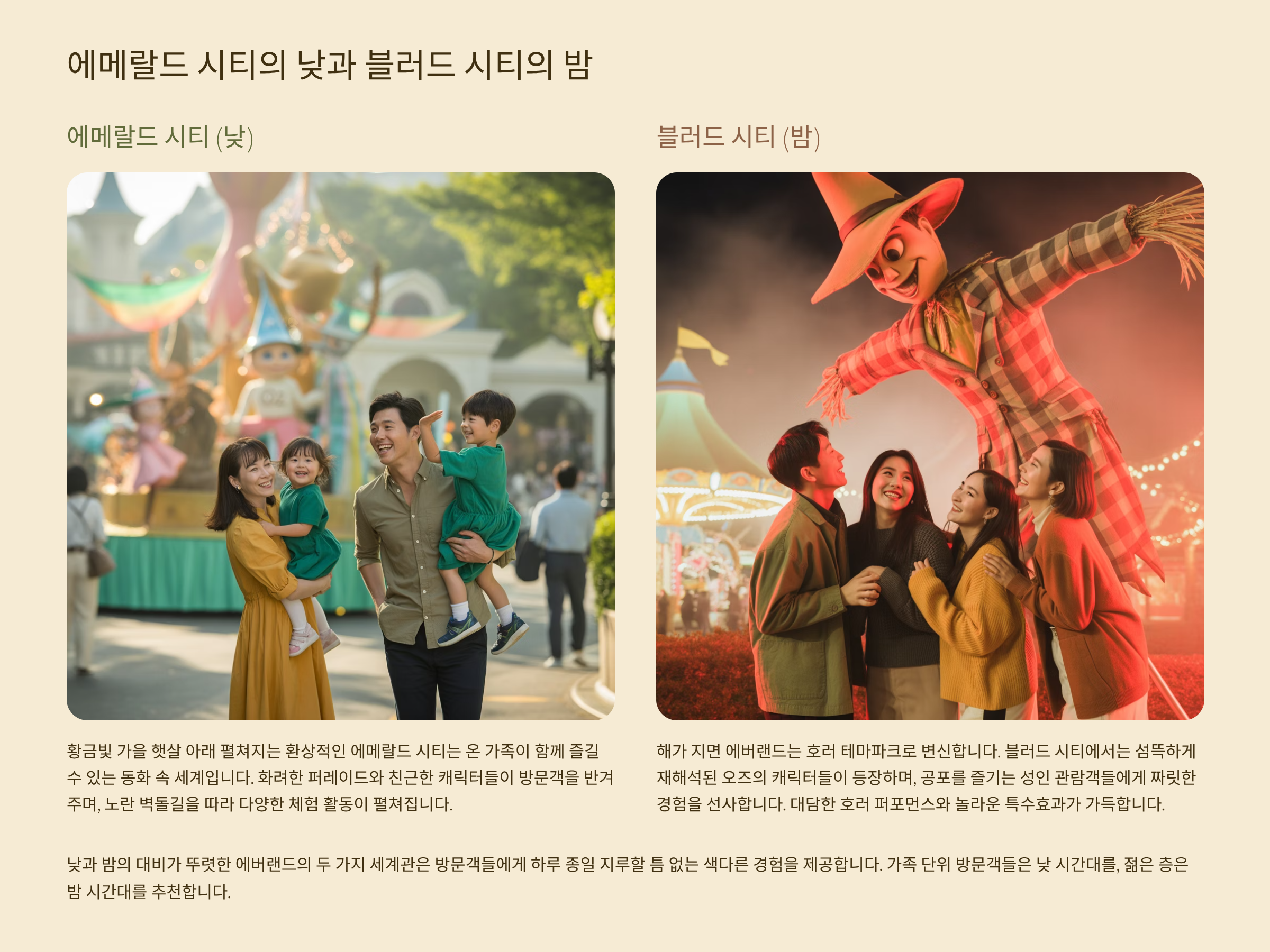 이번 에버랜드 오즈의 마법사 축제의 가장 큰 특징은 바로 '이중 세계관'입니다. 낮에는 도로시와 친구들이 오즈의 마법사를 찾아가는 여정을 담은 밝고 희망찬 '에메랄드 시티'가 펼쳐집니다. 포시즌스 가든 전체가 초록색과 호박 조형물, 가을꽃으로 가득 찬 환상의 공간으로 변신하여, 방문객들은 동화 속 주인공이 된 듯한 기분을 만끽할 수 있습니다. 반면, 밤이 되면 분위기는 180도 달라집니다. 도로시의 집에 깔려 죽은 동쪽 마녀 이야기를 재해석한 '블러드 시티'가 오싹하고 기묘한 공포를 선사합니다. 마녀의 보라색 구두를 메인 컬러로 한 블러드 시티에서는 '크레이지 좀비 헌트 인 오즈'와 같은 공포 공연이 펼쳐지며, 낮과는 전혀 다른 스릴 넘치는 경험을 제공합니다. 이는 모든 연령대의 방문객이 각자의 취향에 맞춰 축제를 즐길 수 있도록 한 에버랜드의 세심한 배려입니다.