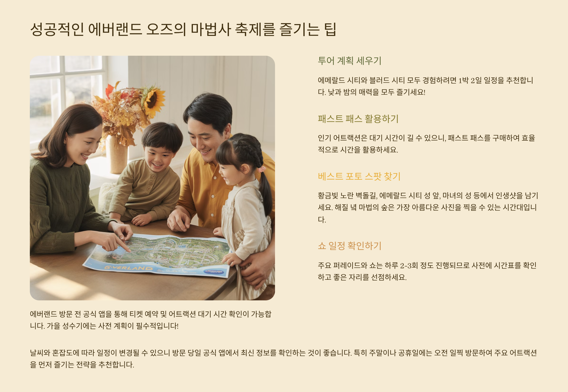 올 가을, 에버랜드에서 펼쳐지는 '에버랜드 오즈의 마법사' 축제는 단순한 테마파크 방문을 넘어, 하나의 거대한 스토리 속으로 들어가는 특별한 경험을 선사할 것입니다. 낮과 밤의 반전 매력, 새로운 기술과 콘텐츠의 결합, 그리고 오즈의 마법사 세계관을 오감으로 체험할 수 있는 다양한 요소들이 여러분을 기다리고 있습니다. 이번 축제를 통해 가족, 친구, 연인과 함께 잊지 못할 추억을 만들어보세요. 더 궁금한 점이 있다면 언제든지 댓글로 물어봐주세요. 😊
