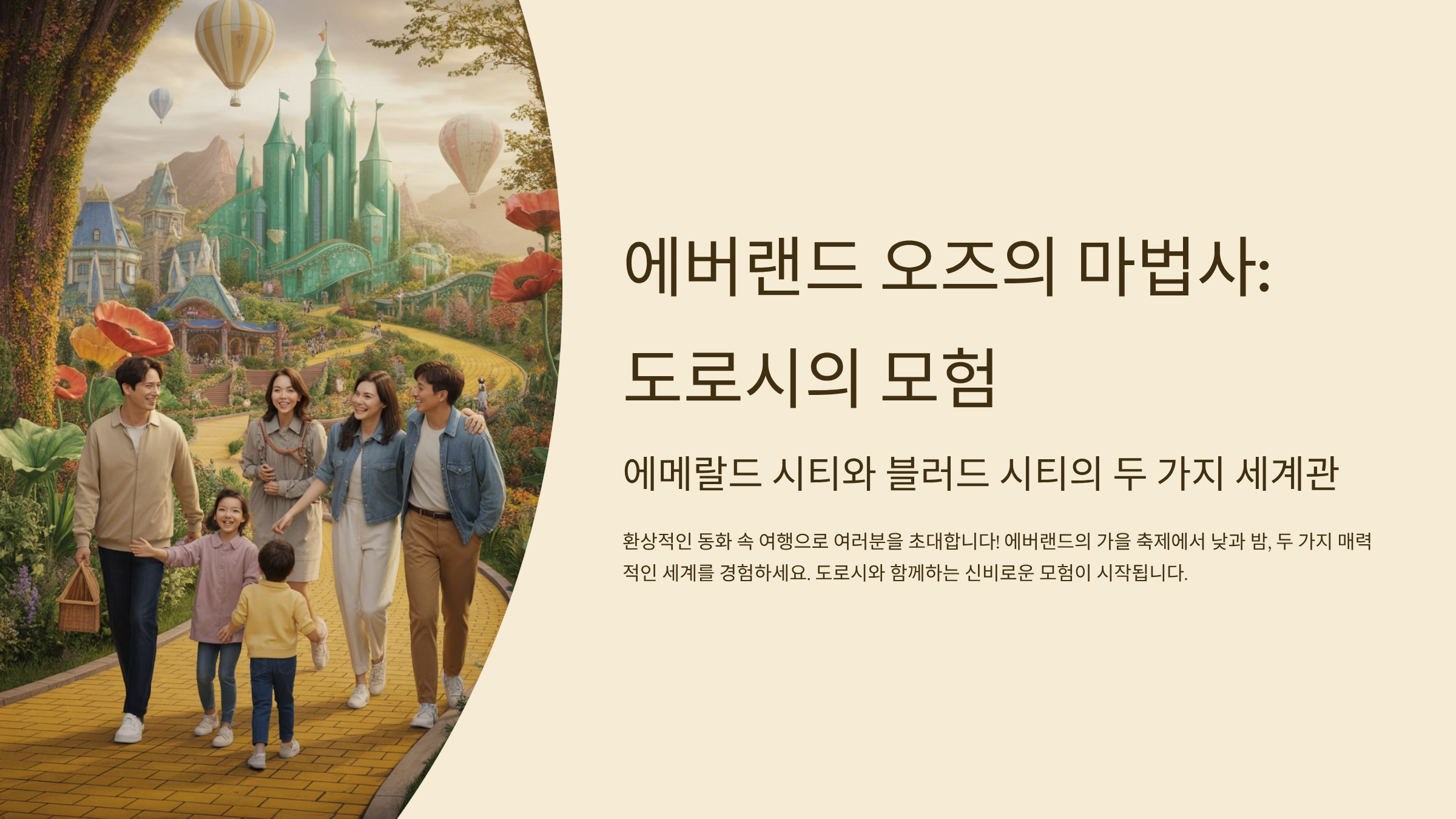 올 가을, 에버랜드가 '오즈의 마법사'를 테마로 한 특별한 축제 '에버랜드 오브 오즈(The Everland Of OZ)'를 선보입니다. 익숙한 도로시와 친구들의 모험 이야기가 에버랜드만의 독창적인 감성과 기술력으로 재해석되어, 방문객들에게 예측 불가능한 새로운 경험을 선사할 예정입니다. 특히, 밝고 환상적인 '에메랄드 시티'와 오싹하고 기묘한 '블러드 시티'라는 상반된 두 가지 세계관을 동시에 즐길 수 있어 더욱 기대를 모으고 있습니다. 단순히 원작을 재현하는 것을 넘어, 몰입형 콘텐츠와 다양한 즐길 거리를 통해 오즈의 마법사 세계로 여러분을 초대합니다.