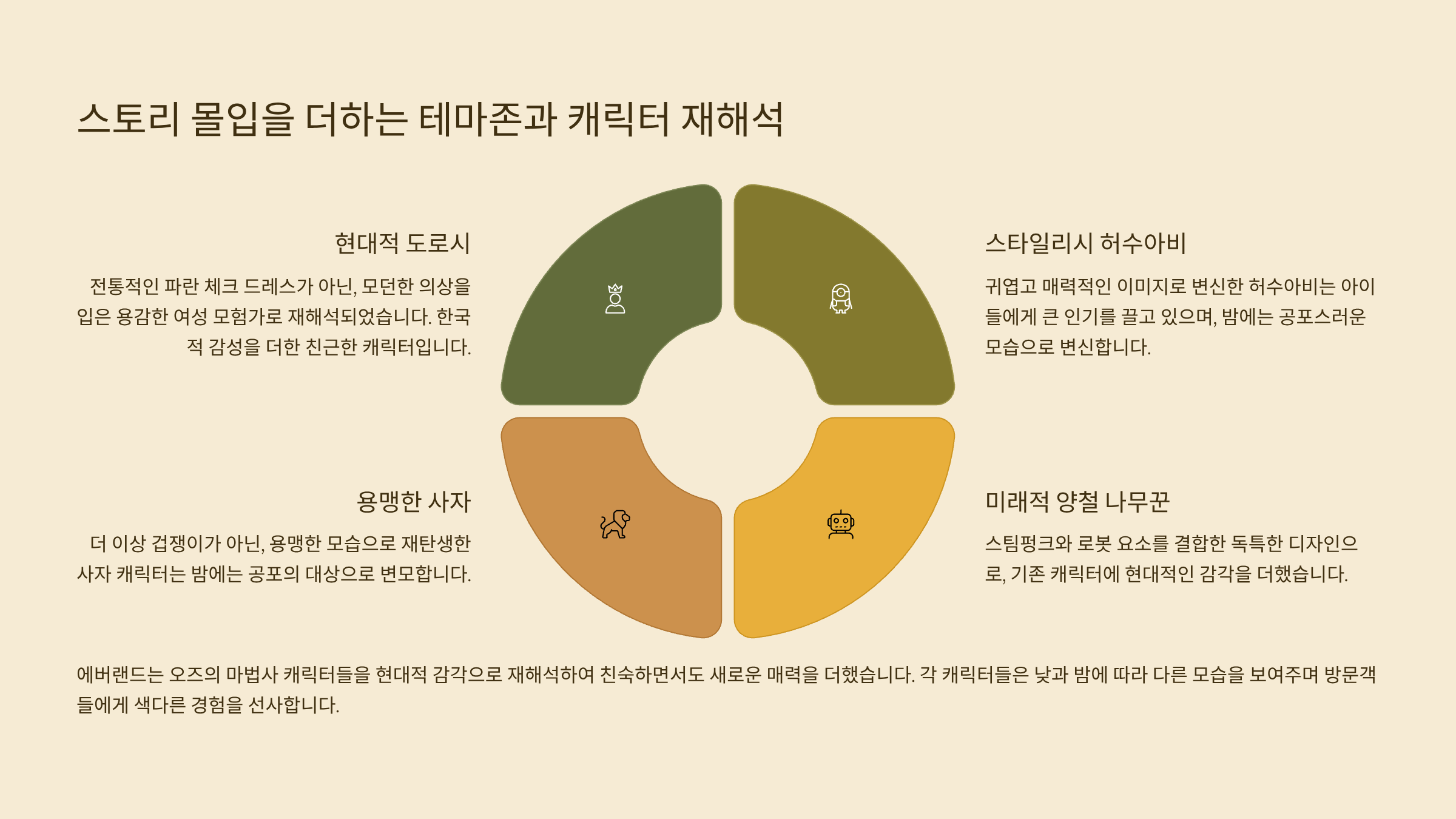 에버랜드는 이번 축제를 위해 오즈의 마법사 속 세계관을 세밀하게 구현했습니다. 특히 넷플릭스 오리지널 시리즈 <오징어 게임>의 미술 감독이었던 채경선 감독이 연출에 참여하여, 각 테마존에 생동감과 몰입감을 더했습니다. 포시즌스 가든의 '에메랄드 시티'는 도로시와 친구들의 모험을 따라 허수아비, 양철 나무꾼, 겁쟁이 사자 등 캐릭터별 테마존으로 꾸며져 방문객들이 마치 이야기 속으로 걸어 들어간 듯한 느낌을 받게 합니다. 또한, 블러드 시티는 동쪽 마녀의 저주로 인해 좀비가 되어버린 도로시와 친구들의 이야기를 모티브로, 기존의 으스스한 분위기에 오즈의 마법사 스토리를 절묘하게 결합해 새로운 공포 경험을 창조했습니다. 이러한 재해석은 단순히 원작을 따라가는 것을 넘어, 에버랜드만의 독창적인 스토리텔링을 통해 축제의 재미를 한층 끌어올립니다.