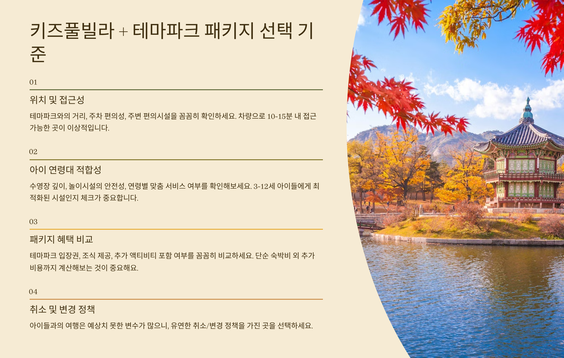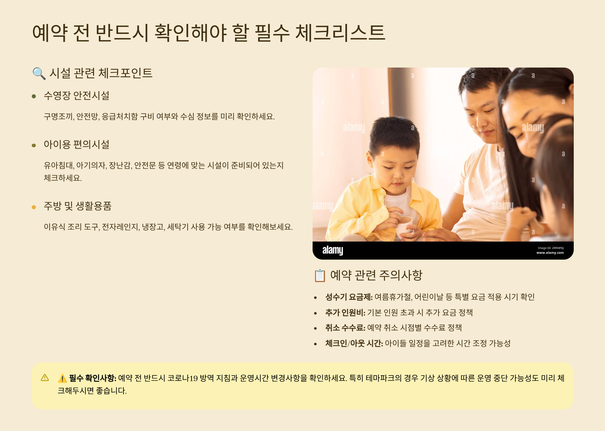 A: 가장 중요한 것은 아이의 연령에 맞는 시설이 갖춰져 있는지, 그리고 청결 상태가 어떤지 확인하는 것입니다. 또한 테마파크와의 거리가 가까운지, 온수 수영장 이용료가 추가되는지 등 부가적인 비용을 꼼꼼히 체크해야 합니다.