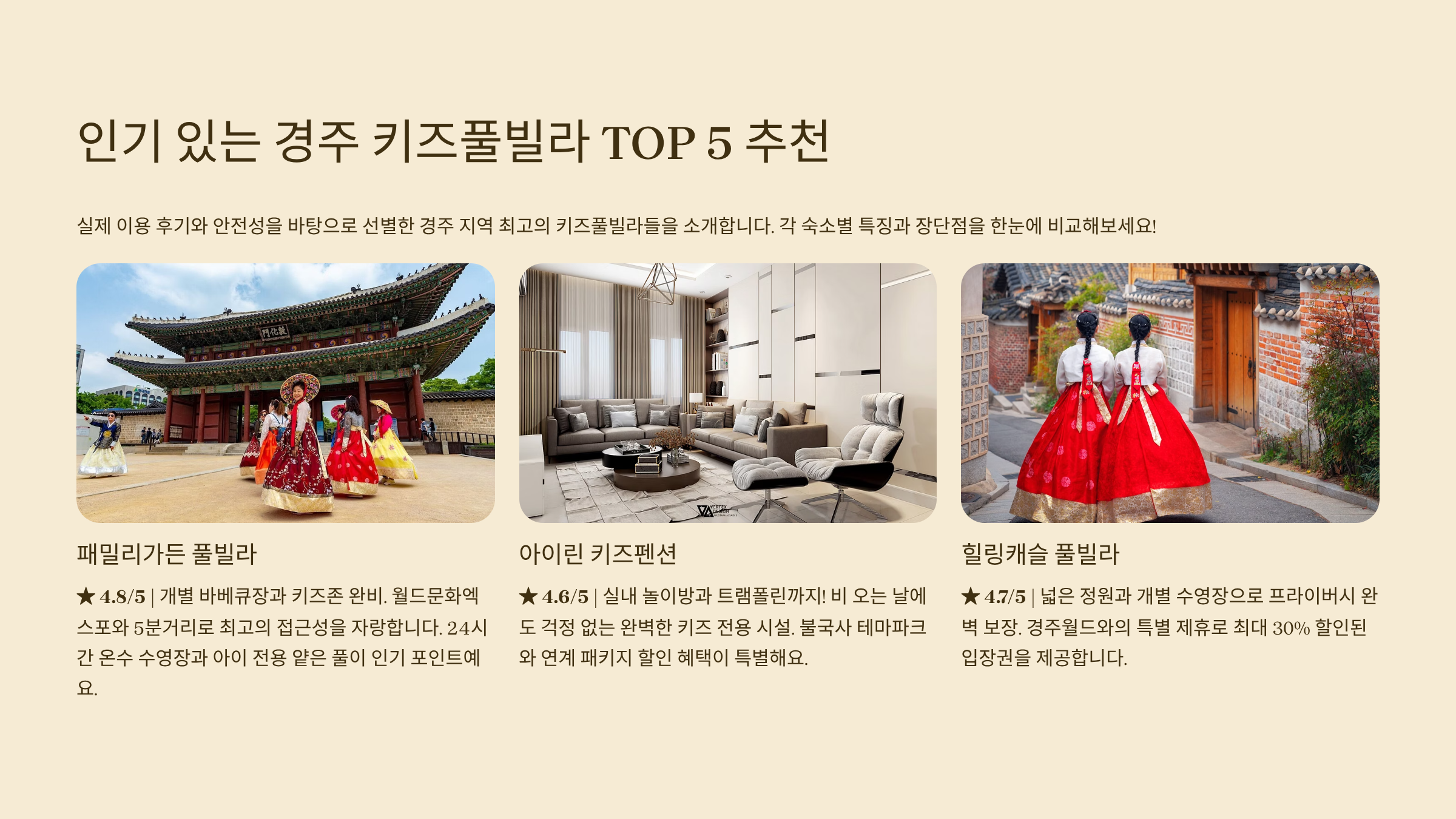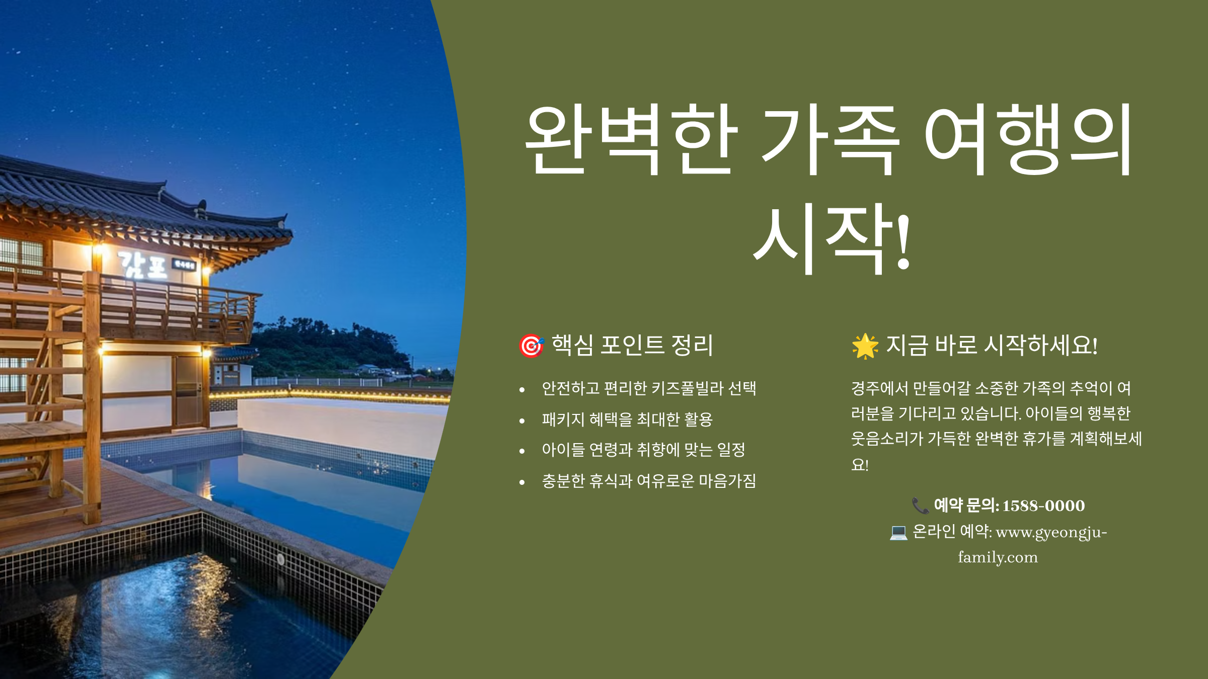 이 글이 여러분의 경주 키즈풀빌라와 테마파크 패키지 여행 계획에 큰 도움이 되었기를 바랍니다. 경주에서 아이와 함께 잊지 못할 행복한 추억을 만들고, 재충전의 시간을 보내세요. 😊