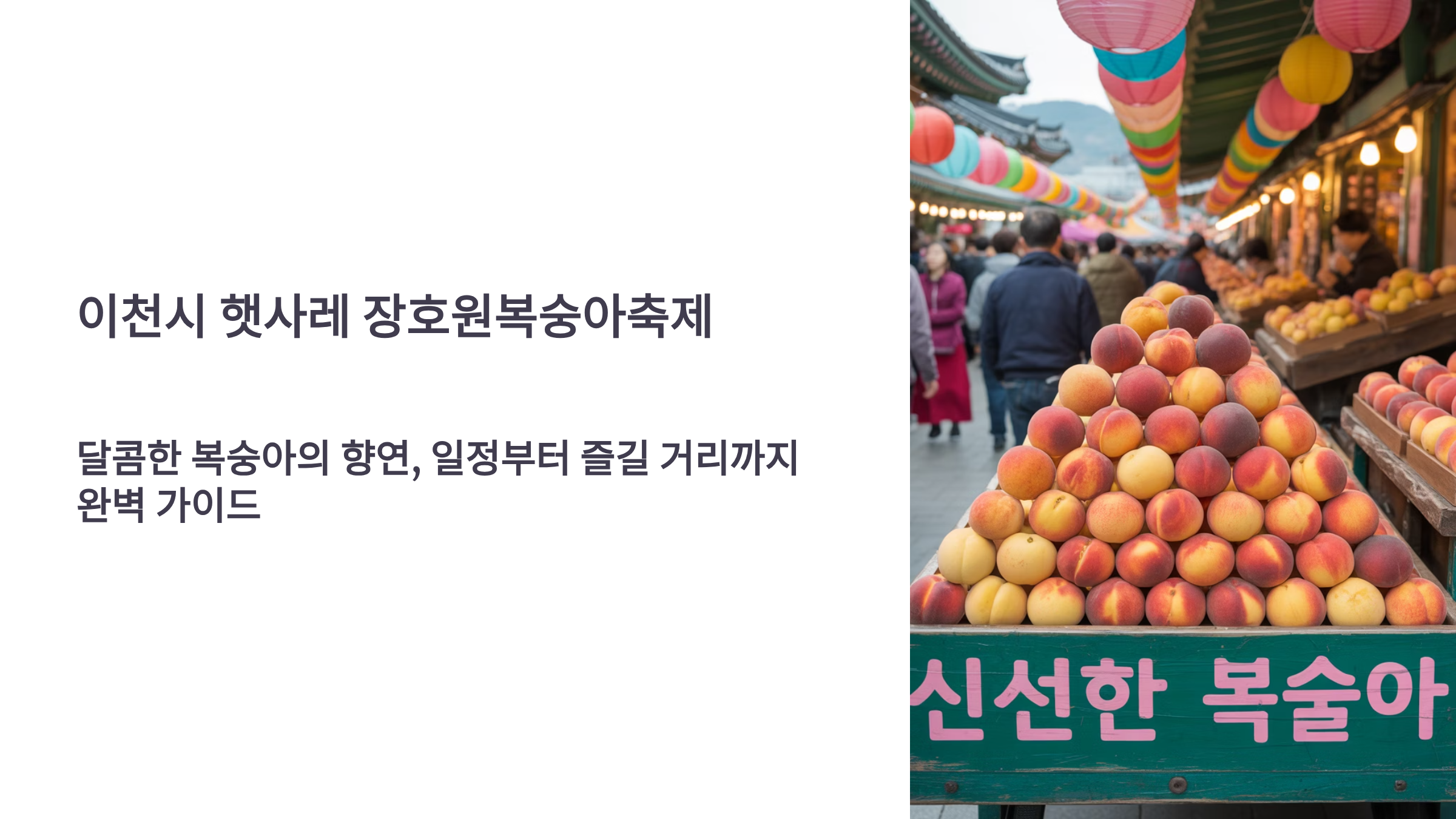 향긋한 가을의 시작을 알리는 이천시 제29회 햇사레 장호원복숭아축제가 오는 9월 19일부터 21일까지 3일간 개최됩니다. 풍부한 햇살과 비옥한 토양에서 자란 햇사레 복숭아는 그 뛰어난 당도와 풍부한 과즙으로 이미 전국적인 명성을 얻고 있습니다. 이번 축제는 '풍성한 결실! 장호원 황도와 함께~'라는 주제로, 단순히 복숭아를 맛보는 것을 넘어 다양한 문화 공연, 체험 프로그램, 그리고 특별한 이벤트들을 통해 방문객들에게 잊지 못할 추억을 선사할 것입니다. 특히 올해는 더욱 알차고 풍성한 프로그램들이 준비되어 있어, 가족, 연인, 친구들과 함께 방문하기에 최적의 가을 축제가 될 것입니다.