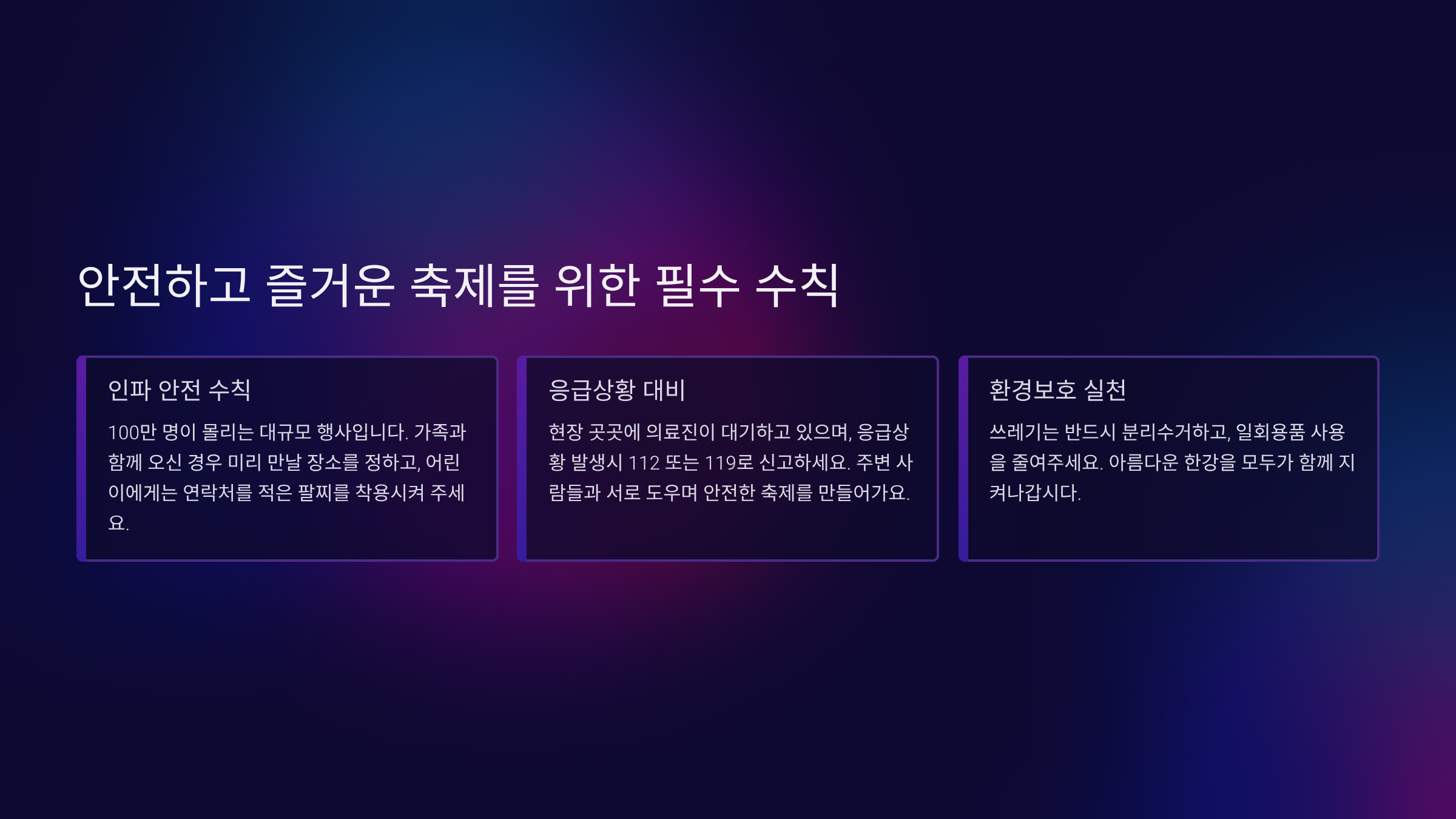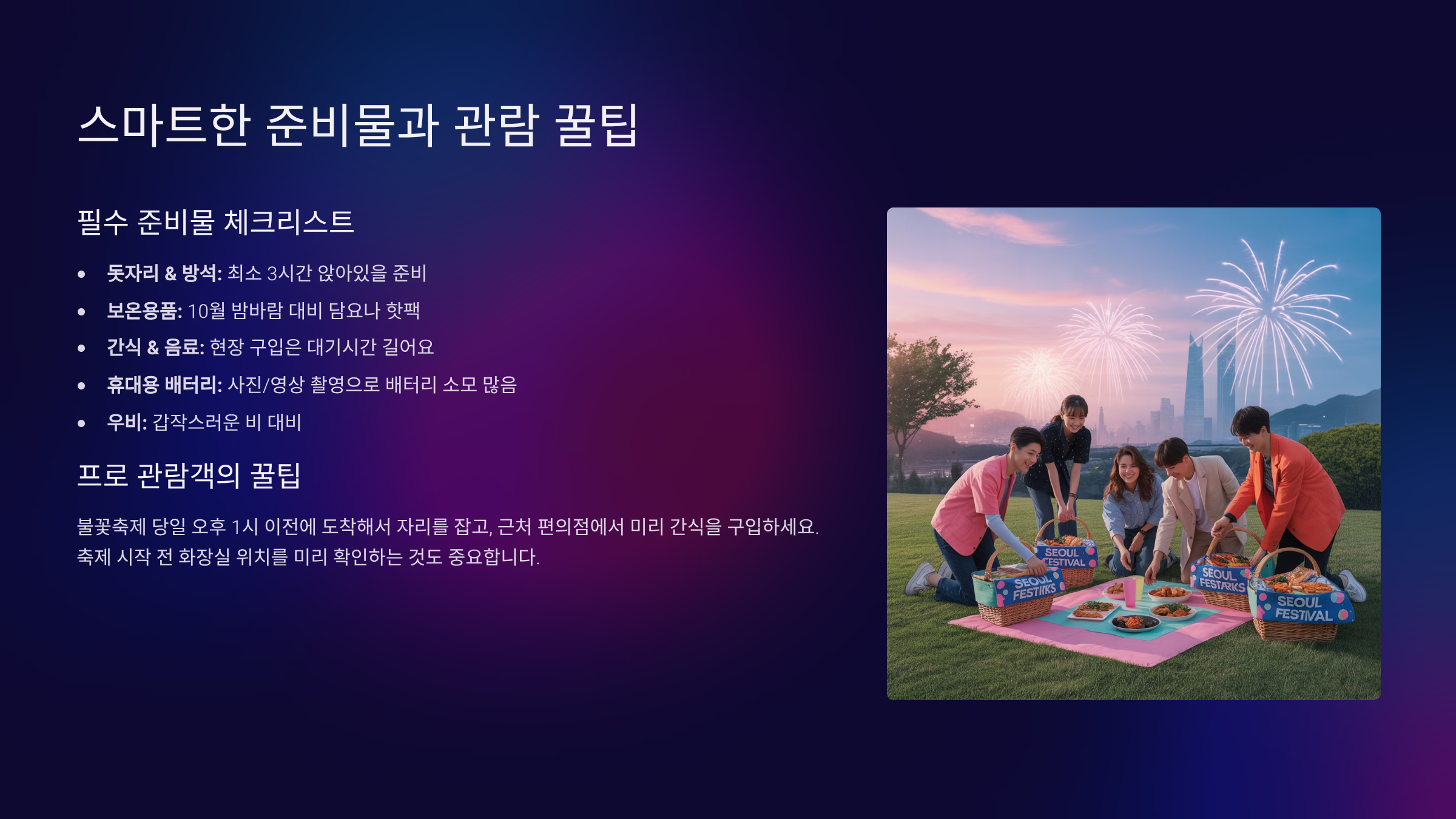 2025년 여의도 불꽃축제, 사전 준비와 계획으로 잊지 못할 가을밤의 추억을 만들어보세요. 모두가 함께 즐기고, 안전을 지키는 성숙한 시민 의식으로 더욱 빛나는 축제가 되기를 바랍니다. 😊