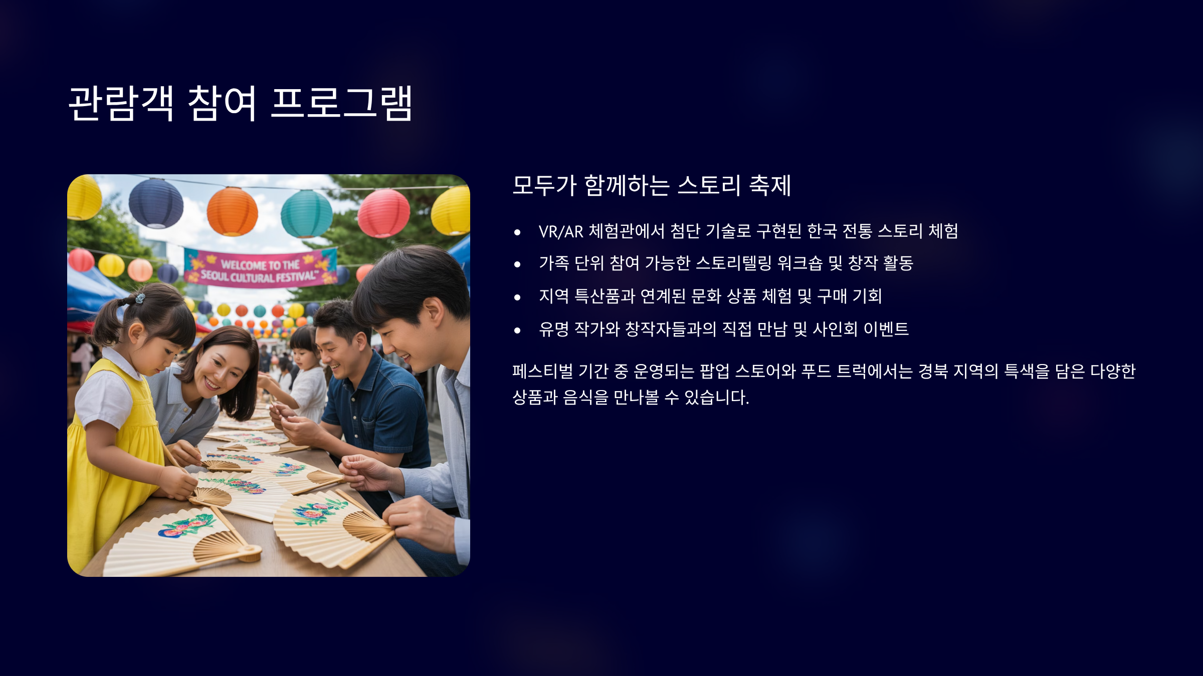 사용자 경험 강조:체험 부스, 낭독회 등 온 가족이 즐길 수 있는 참여형 행사